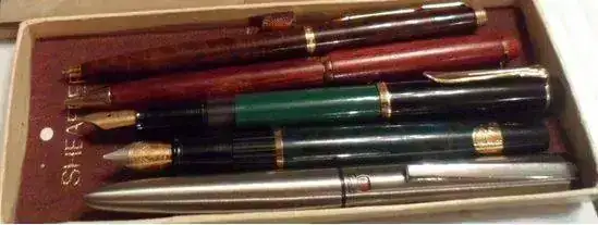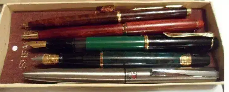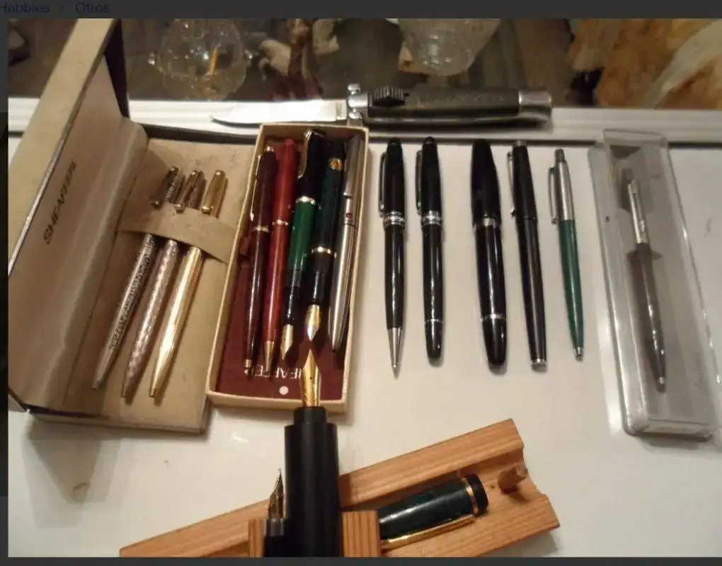 Saludos amigos. Alguien que quiere salir de un lote de plumas en una página de compra-venta de cosas en mi país (Venezuela) ha puesto en venta varias plumas-bolígrafos. Entre ellas me han llamado la atención dos plumas que están en la parte central de estas fotografías: una Pelikan y una Waterman (la primera en color verde sólido con negro y la otra en un verde más oscuro estilo marbled, por lo que veo). No identifico qué modelos son, pero en el caso de la primera pareciera una Pelikan "vintage", ya que no es como las m200, m400 o m600 de ahora (que tienen esta misma estructura pero el barril tiende a tener una decoración estriada y no sólida en el patrón del color).