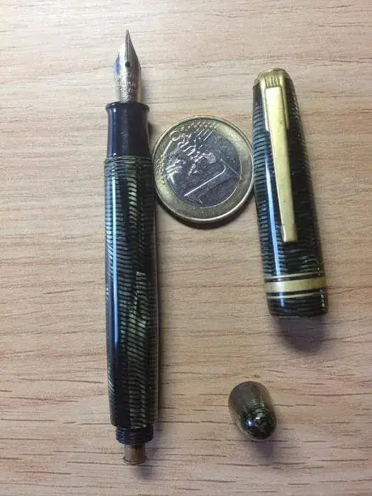 Como podéis ver en las fotos es una pluma pequeña y bonita, que parece una vacumatic salvo por el tipo de carga que es mediante botón. Debería tener unos 50 años.