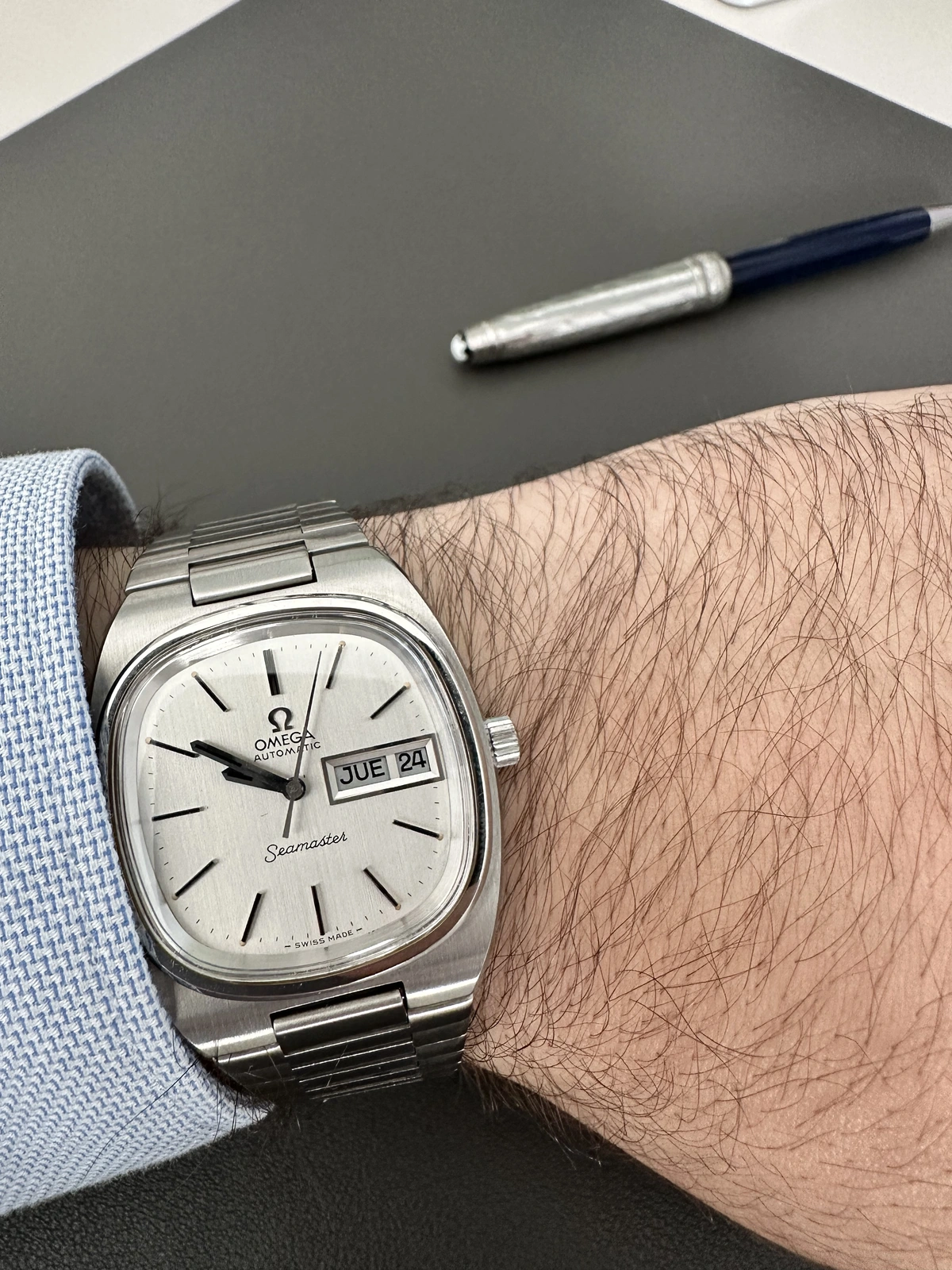 como bien sabéis nunca se alcanza la paz relojera y siempre me han llamado la atención y gustado los Omega con caja cuadrada tipo TV de los 70s. Nunca me había lanzado a por uno por el miedo a que lo que compro, tenga una vida futura conmigo larga y plena, después de haberlo dado todo probablemente cerca de 50 años.