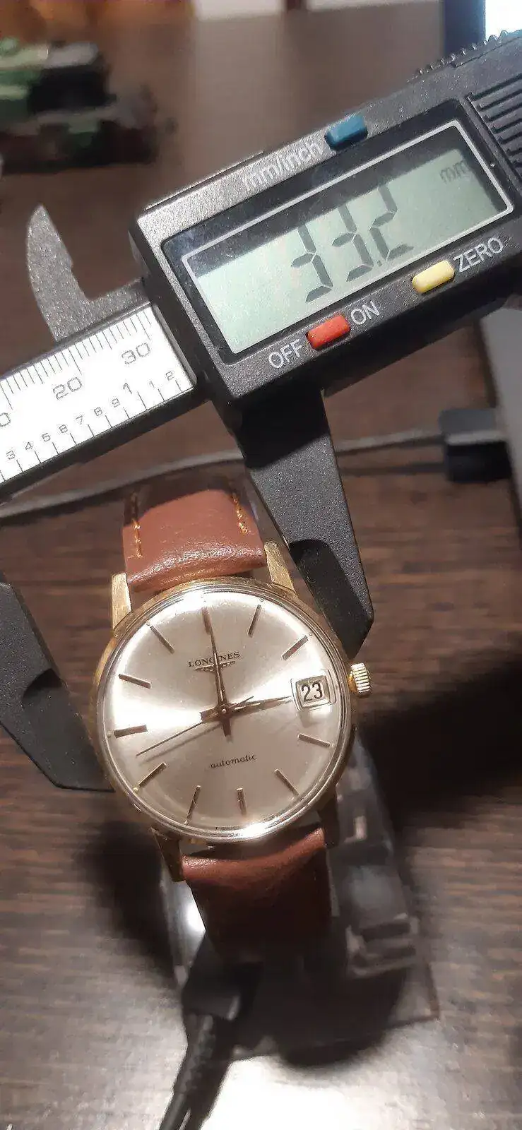 Yo ese reloj lo medí con el calibre, un Mitutoyo, no uno chino. Y me daba una medida de 34.5 mm