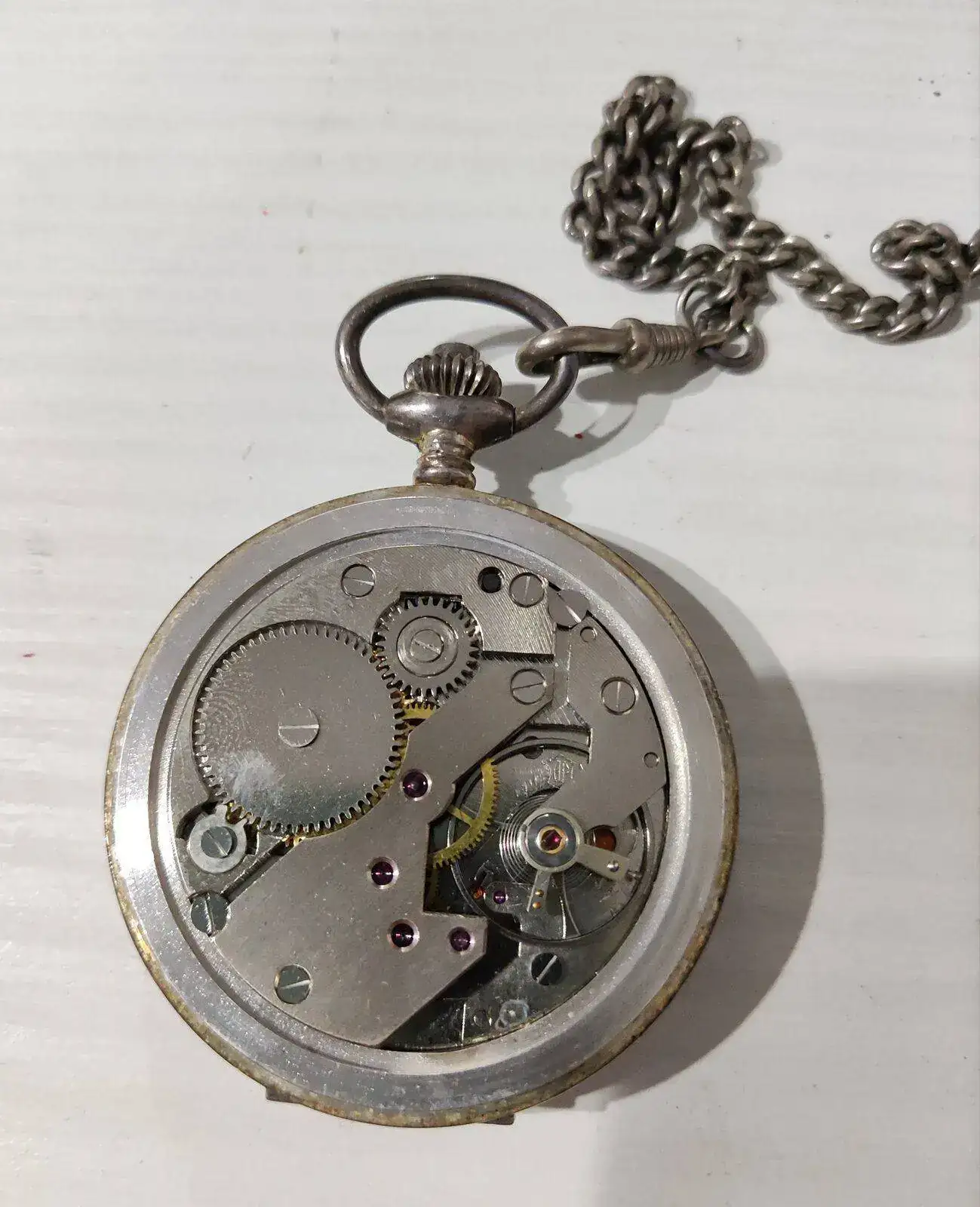 La caja está muy deteriorada y de difícil arreglo, además de las abolladuras le falta la parte superior del cuello donde encaja la anilla, y recomponer eso no es un trabajo que lo pueda hacer cualquiera. Se le podría poner el cuello y anilla de otro reloj de plata, pero ya no sería del reloj de la familia. Este es un trabajo que no es propiamente de un relojero sino de un cajista.