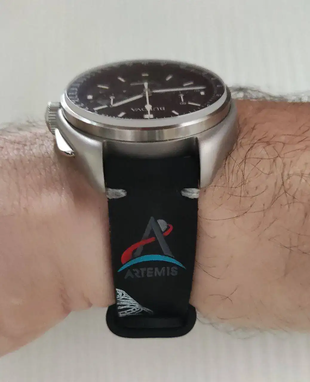 ... y por la que realizó para conmemorar el Programa Artemis, que volverá a pisar la luna para establecer una base permanente allí y lo hará incluyendo a la primera mujer en llegar a nuestro satélite (para estas dos correas he usado pasadores curvos):