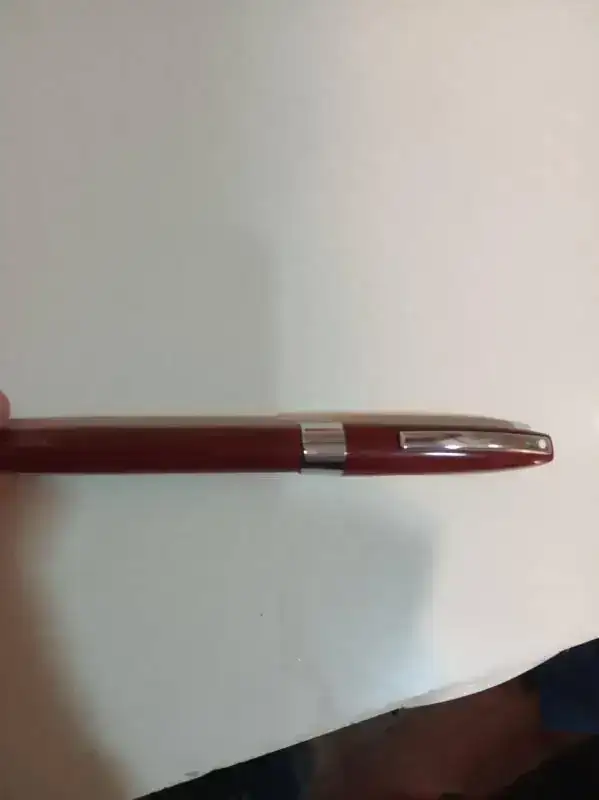 La pluma viene en un estuche rojo y la acompaña otro que contiene un bolígrafo cuyo pulsador se encuentra en el elemento que sirve para abrazarla a la camisa.