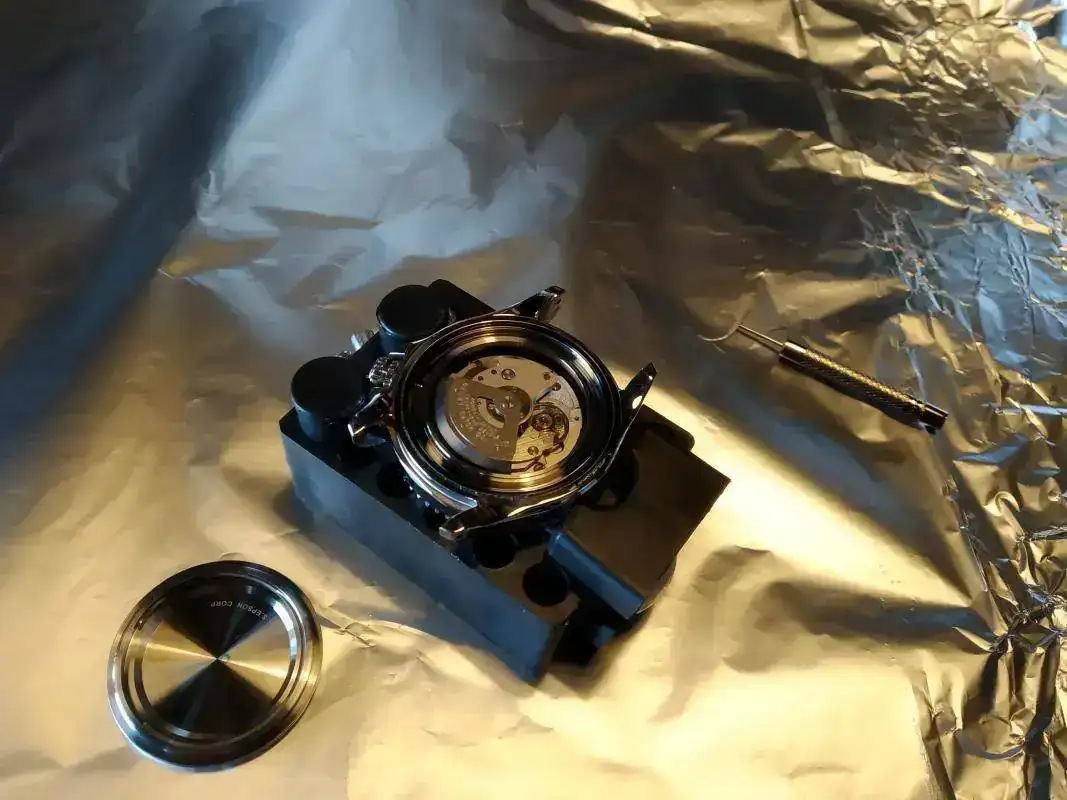 El tema era sobre un Omega Seamaster y con la trasera abierta, donde se veía que el calibre era mas pequeño que la caja y estaba metido como en plástico, para rellenar. Algo parecido a los relojes de cuarzo.