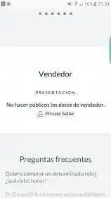 Os comento, he visto en Chrono24 un Omega a muy muy buen precio que me hace ojitos. Y como digo, antes de lanzarme a la piscina quería plantearos unas dudas que me han surgido: Nunca he comprado en esta web pero por lo que he podido encontrar por el foro ya me he hecho a una idea de que es fiable, aunque como siempre, hay que tener cuidado con quién lo vende. Y es ahí donde viene el problema, el vendedor aparece como un private seller francés, que según he podido ver tiene (o ha tenido, eso no me queda claro) 2 anuncios en la web, pero aparece la siguiente frase "No hacer públicos los datos del vendedor" (Adjunto foto). Le he enviado un mensaje preguntando acerca del tamaño y estado del reloj y su respuesta ha sido rápida, a penas unas horas, y muy correcta sin apariencia de ser el típico copia y pega de algunas estafas.