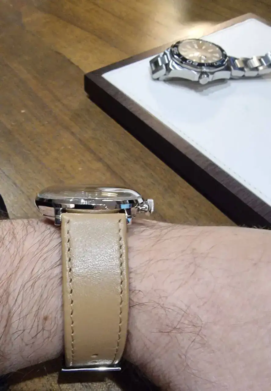 En cuanto a la correa, desconocía que este modelo -como el que tengo yo- viniese con una de color beige. En cuanto a la de avestruz, creo que le queda muy bien.