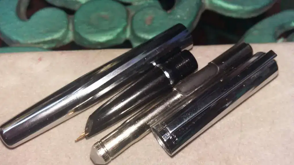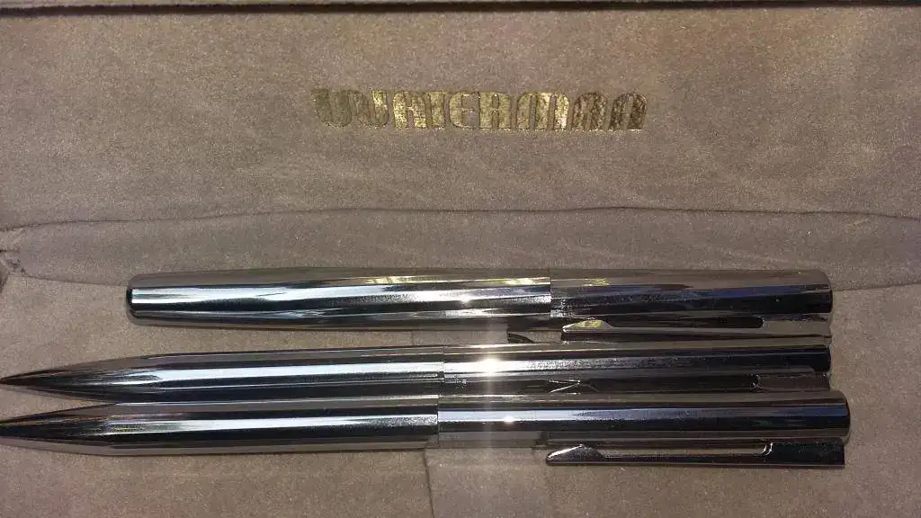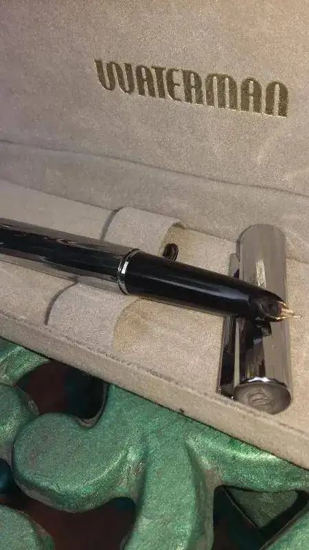 Pues de un cajón de casa de mis suegros (no es broma, de un cajón...) a aparecido este conjunto que no recuerda de dónde vino. Estima que fue un regalo de fin de curso (ha sido 40 años profesora). Después de dejarla un par de días en remojo y limpiarla lo mejor posible (¡Cómo no, la guardó hace un número de lustros indeterminado cargada con tinta!) la voy a devolver al cajón, pero tengo curiosidad sobre ella. Es una pluma pequeña, como de 11 cm cerrada, con la leyanda Waterman Made in France. Y unas cutrefotos que no sé si ayuden o molesten: