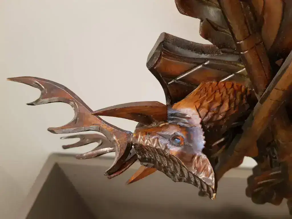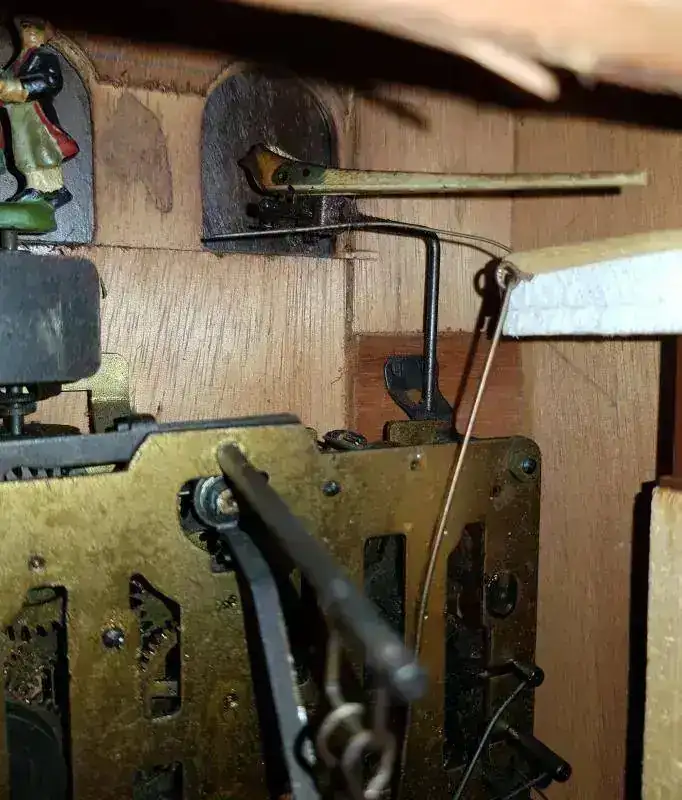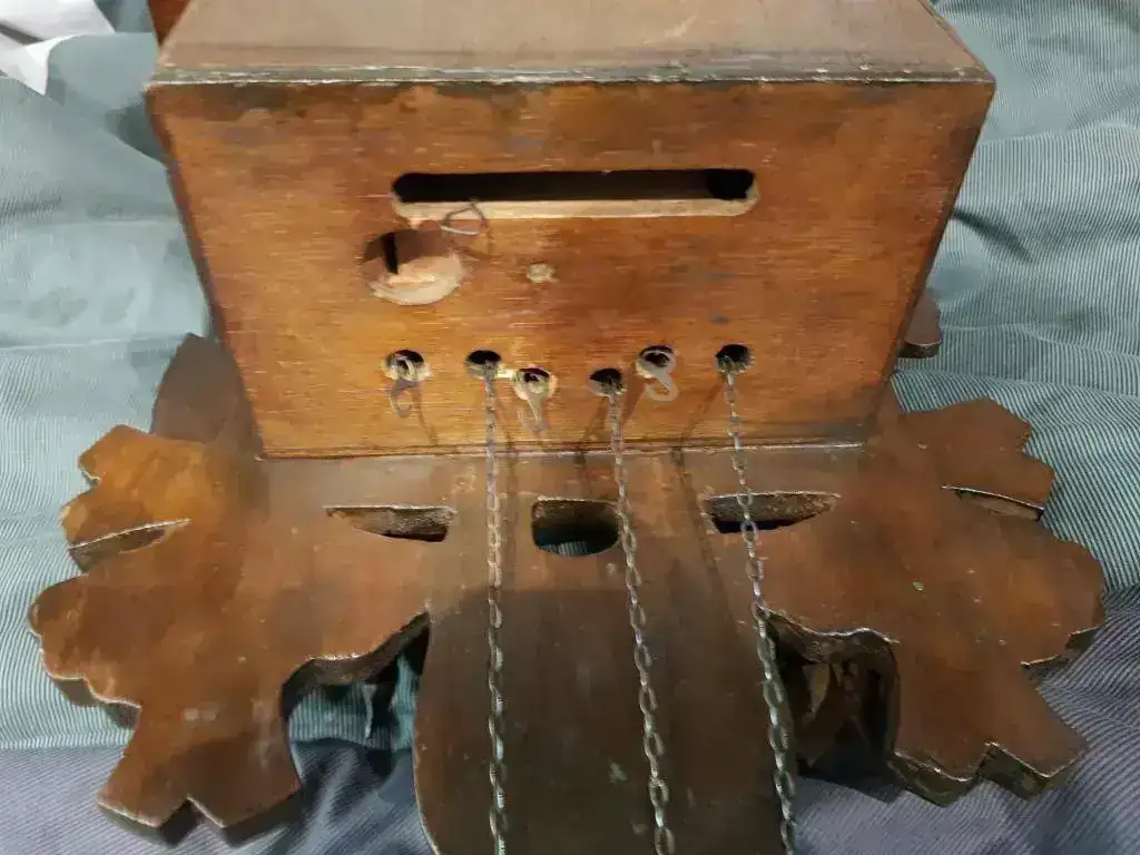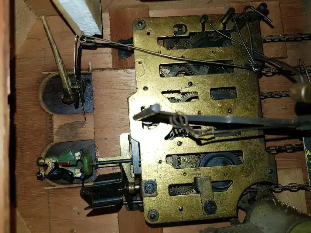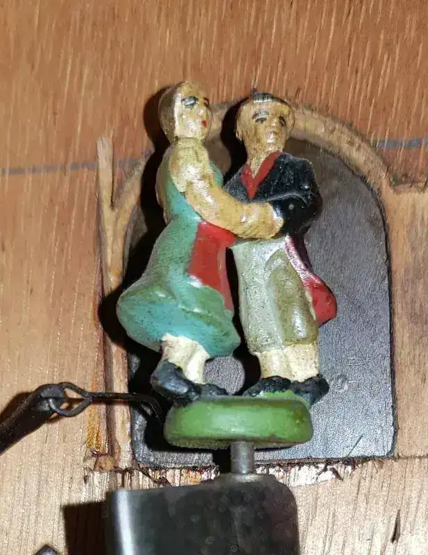 El reloj es un cuco musical, lo cual aumenta el valor y la cuerda es de 1 día. Las agujas del reloj, al igual que los números parecen de madera (vean fotos), y la figura de los bailarines me parece que también. El cuco tiene el pico articulado y parece que llevaba unas alas ya que tiene unos agujeros laterales pero eso me lo tendrán que confirmar ustedes ya que no estoy seguro. También me gustaría decir que tiene una puertecita lateral por donde se puede ver la maquinaria se ve el mecanismo de apertura de la puerta en alguna fotografía arriba del rodillo de música. En los fuelles también tiene agujeros para que el sonido salga al exterior y otros dos agujeros en la parte trasera para poder colgar el cuco, uno en la puerta de apertura y otro mas arriba.