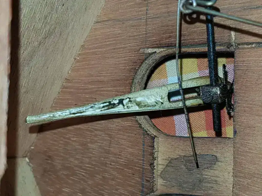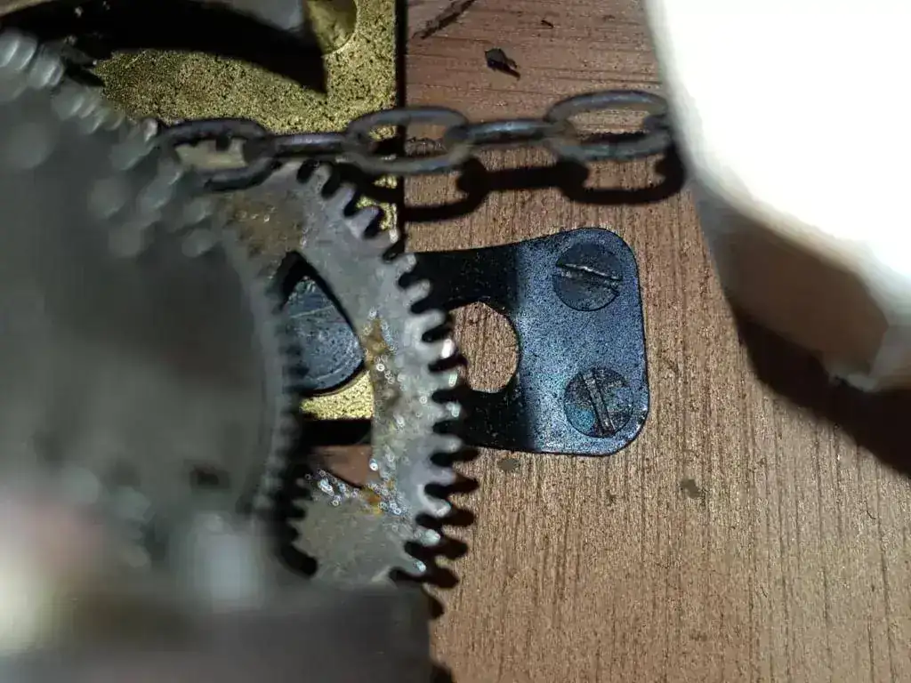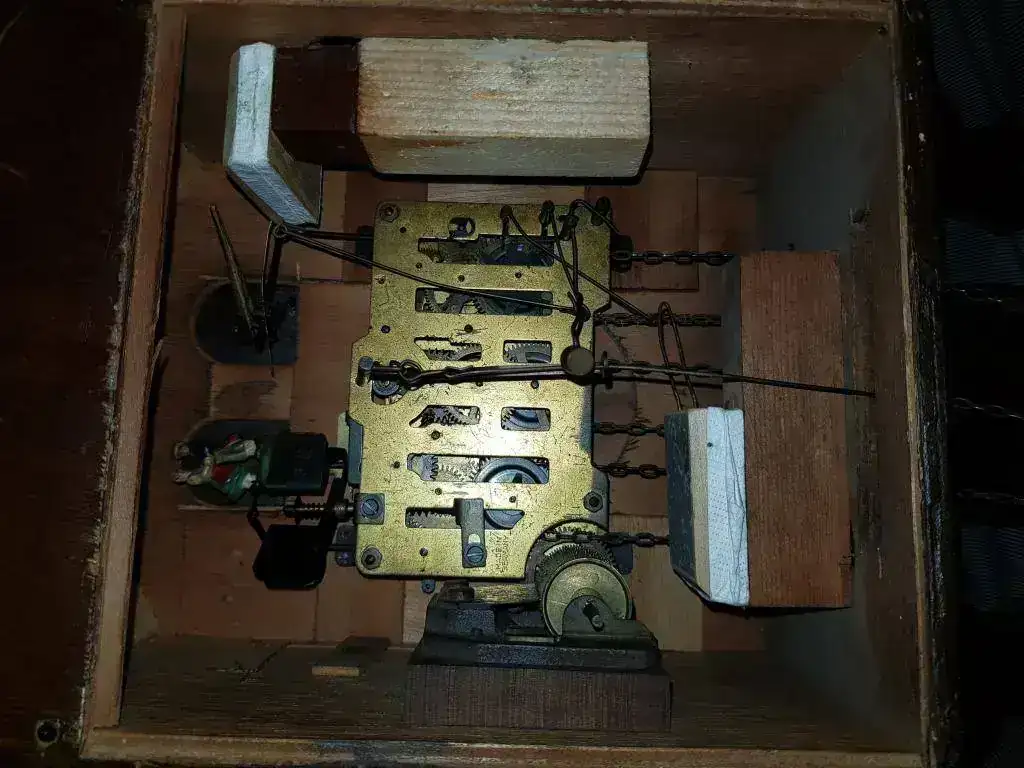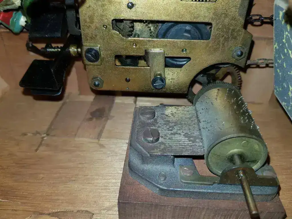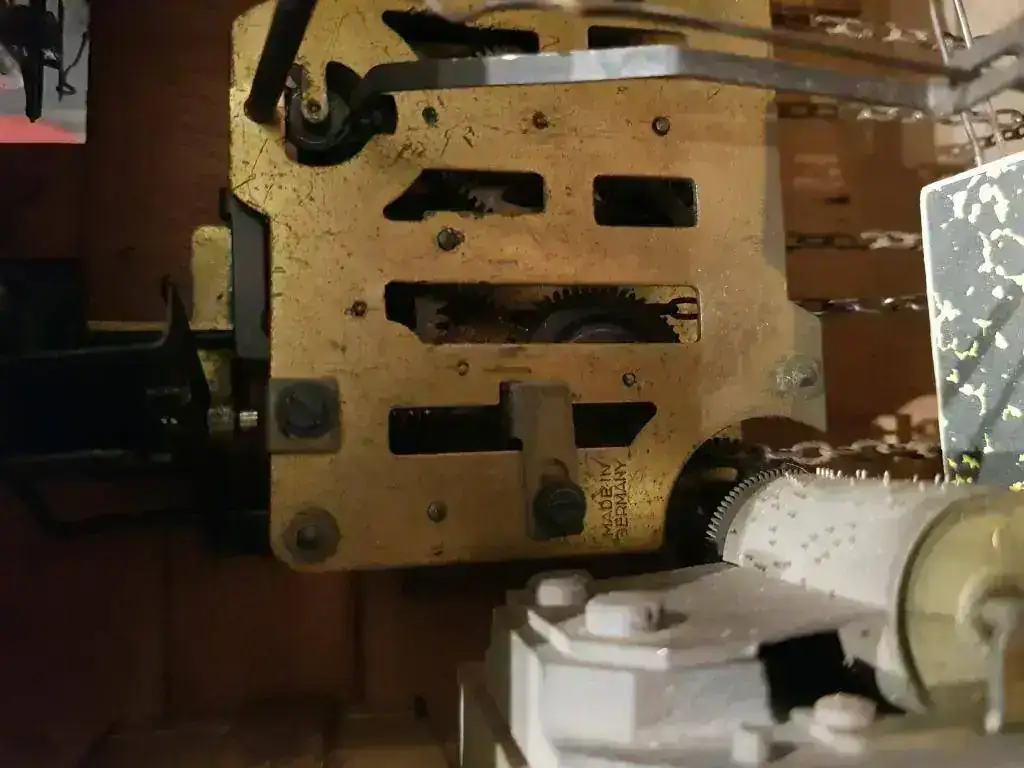 Tal y como he hablado anteriormente la maquinaria del reloj es de acero y latón y no tiene ninguna pieza de plástico a excepción de un fuelle que ha sido reparado y cambiado por uno moderno, por ese motivo es de plástico. Hasta la fecha todos los que he visto llevaban los fuelles en las paredes de la caja a excepción de este que tiene el ventolín en el suelo lo cual es muy raro y desconozco el porqué.