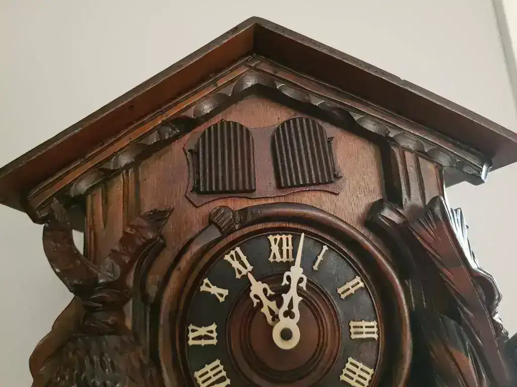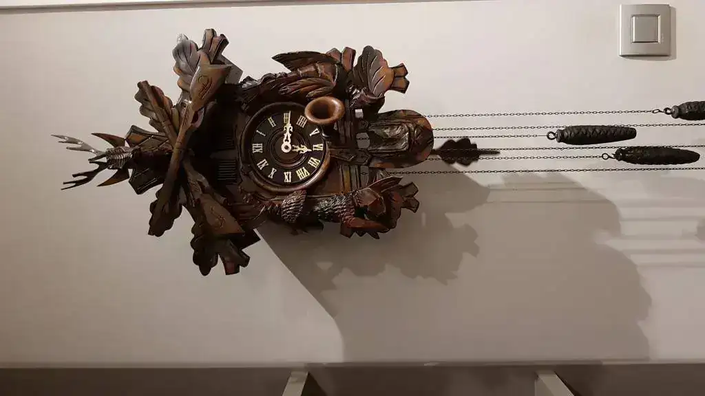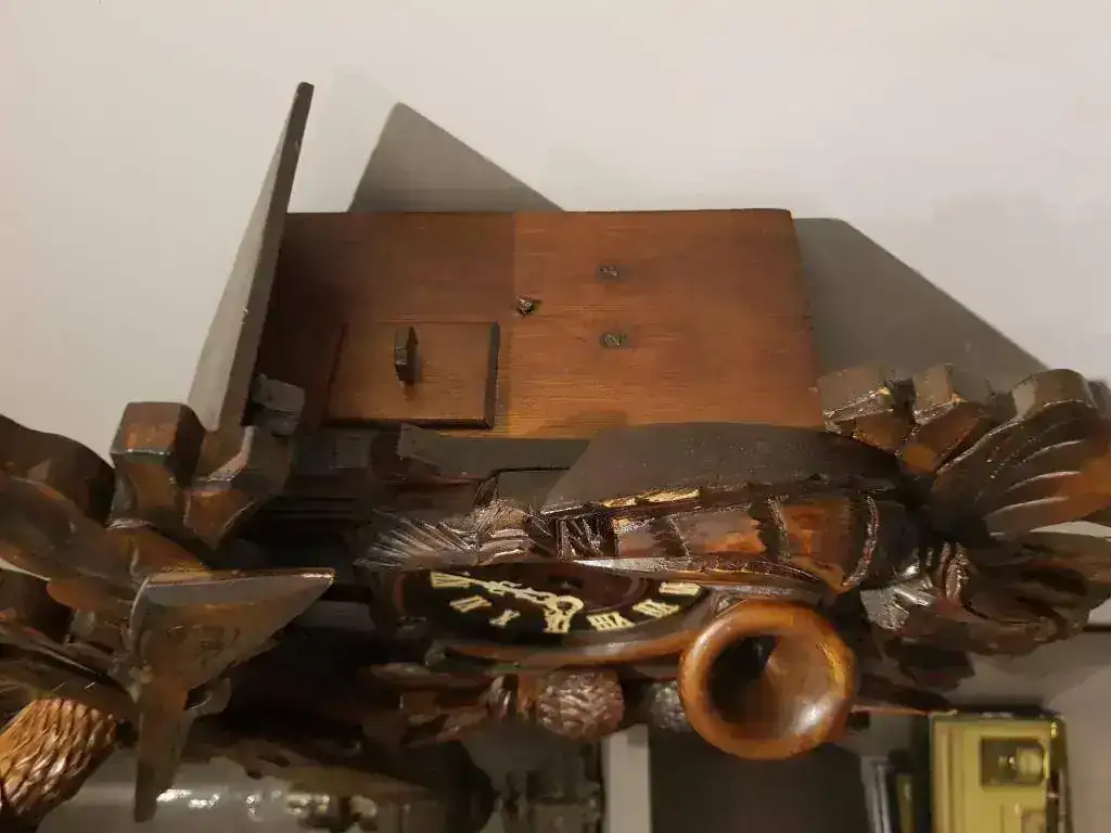 Me gustaría poder saber de que fecha es y si todo lo que he dicho es correcto (agujas, números y bailarines de madera) también tengo la duda de el porqué hay algunos cucos con el gatillo de la escopeta hacia bajo y otros hacia arriba (el cañón siempre mira hacia arriba), se hicieron hacia arriba a partir de alguna fecha o es de algún fabricante en concreto? También si pudiesen aportar cualquier otra información si saben el fabricante o el motivo del porqué tiene un ventolin en el suelo cualquier cosa me seria de gran ayuda ya que es mi primer cuco.