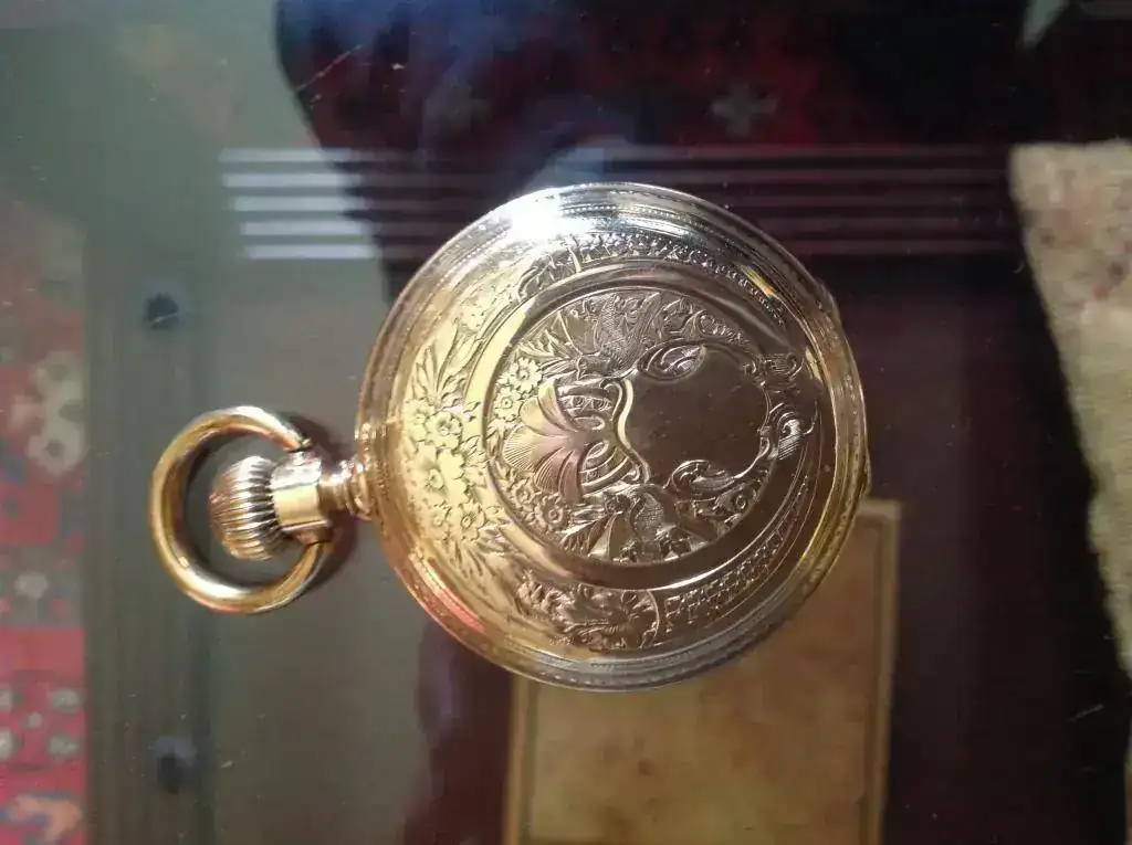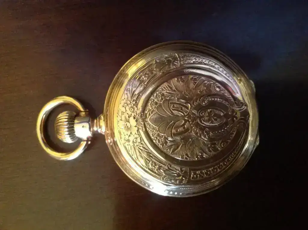 Tapa anterior : oro 18K con motivos florales en el exterior de un circulo ,al interior dos palomas,que sostienen hoja de palmera y escudo liso, al interior marca de 18 K y Numeracion de serie 11959.