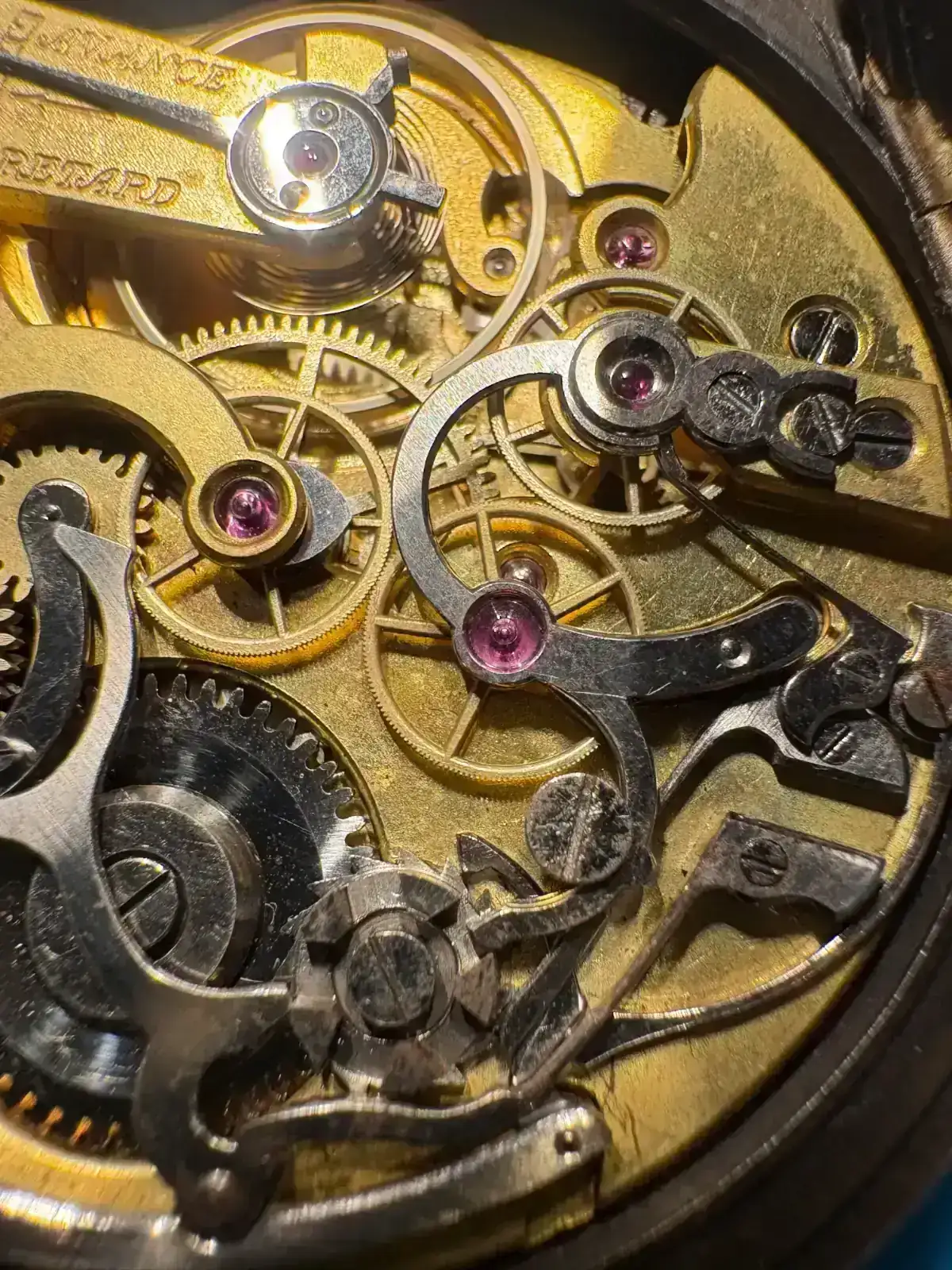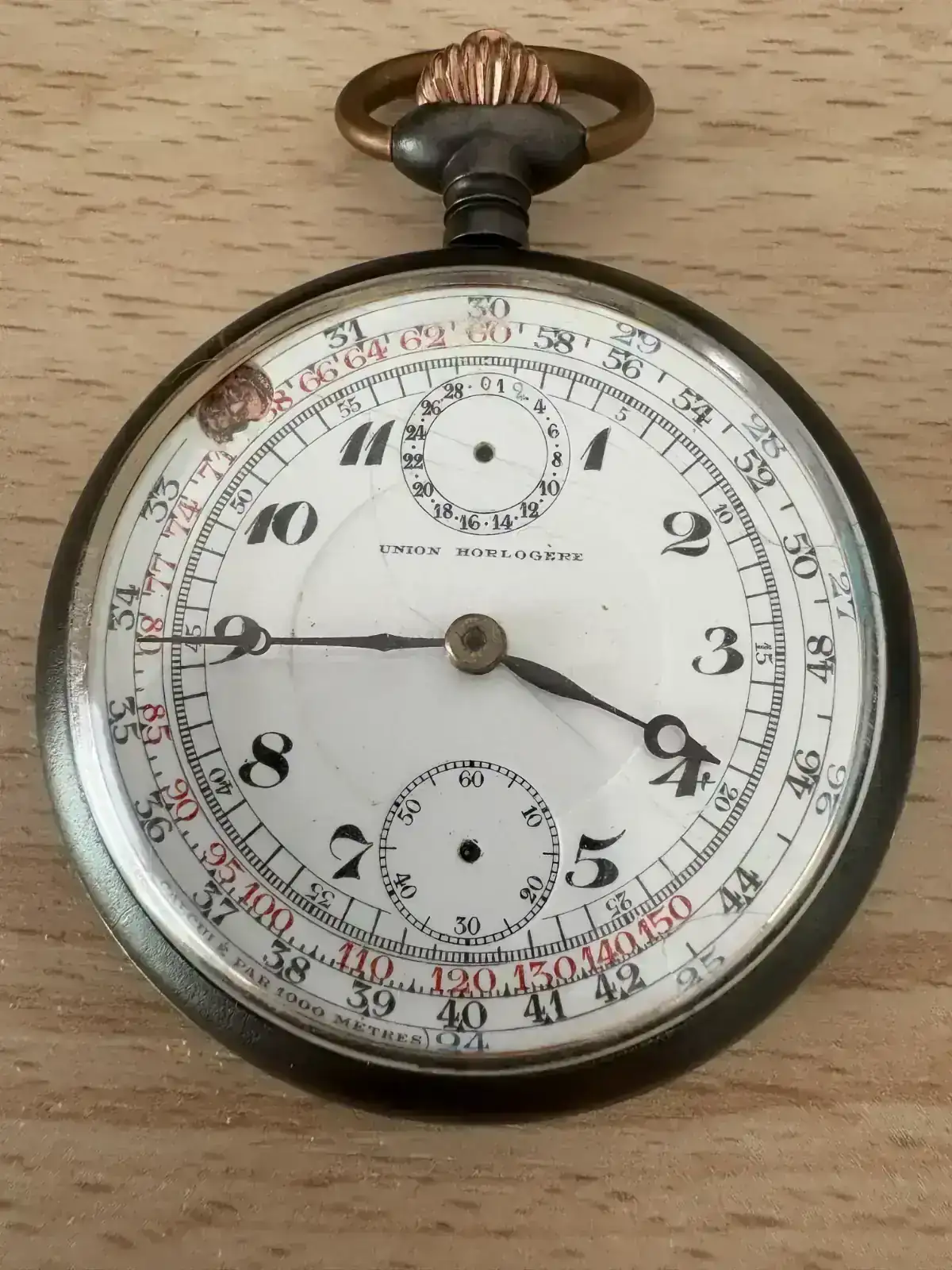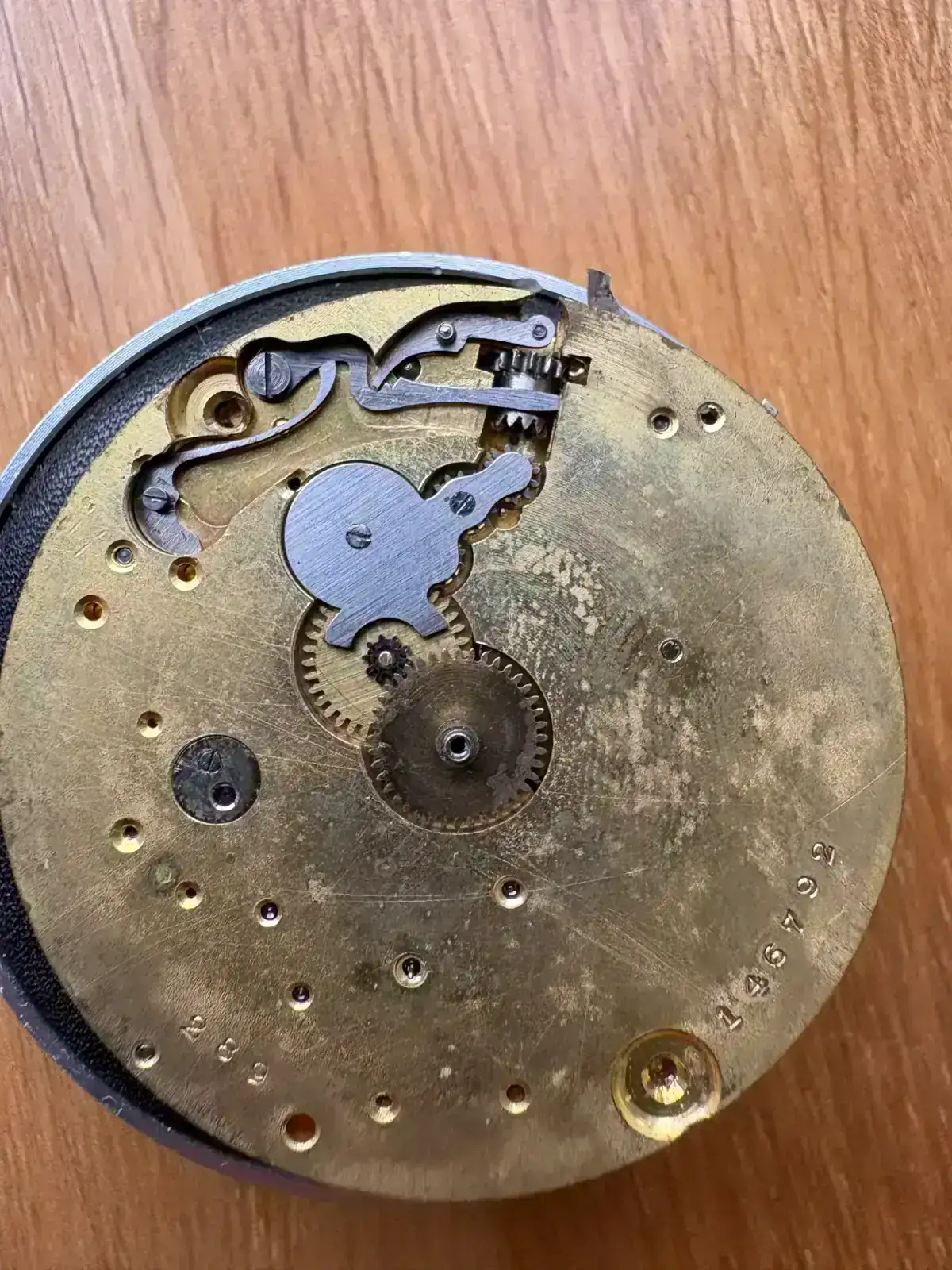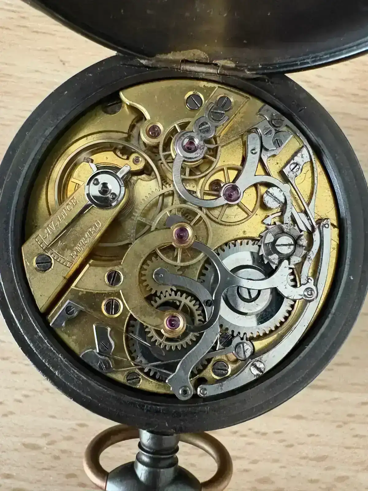 Pues resulta que voy a comenzar con la restauración de este reloj de bolsillo con la complicación de cronómetro accionado por mono pulsador y me gustaría saber de qué movimiento se trata. El movimiento mide 40,4 mm aproximadamente.