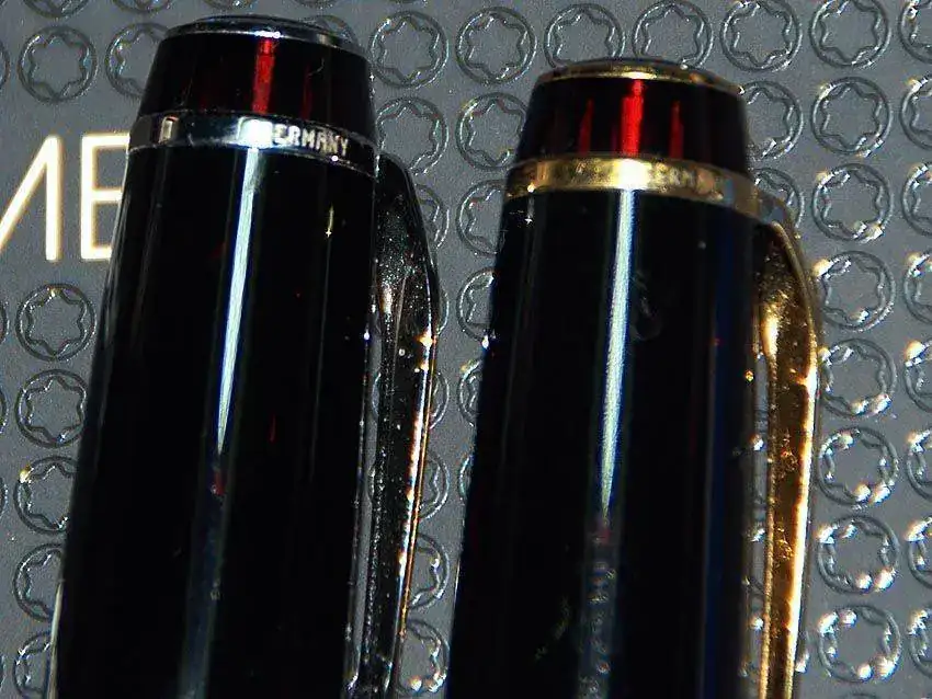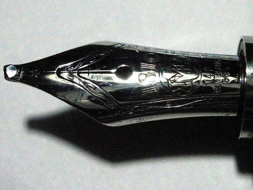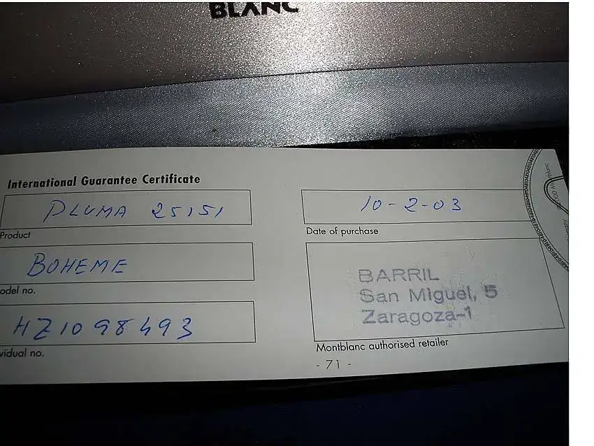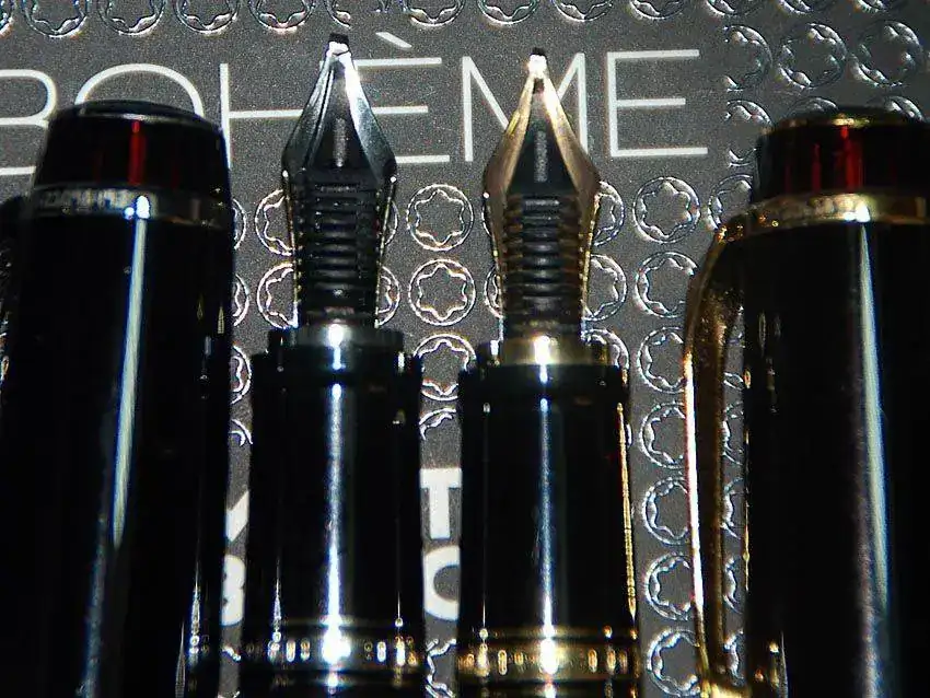 Se trata de una MB Boheme Platino del 2003 con plumín OB 585 14k. En el extremo del alimentador esta grabada una "C".