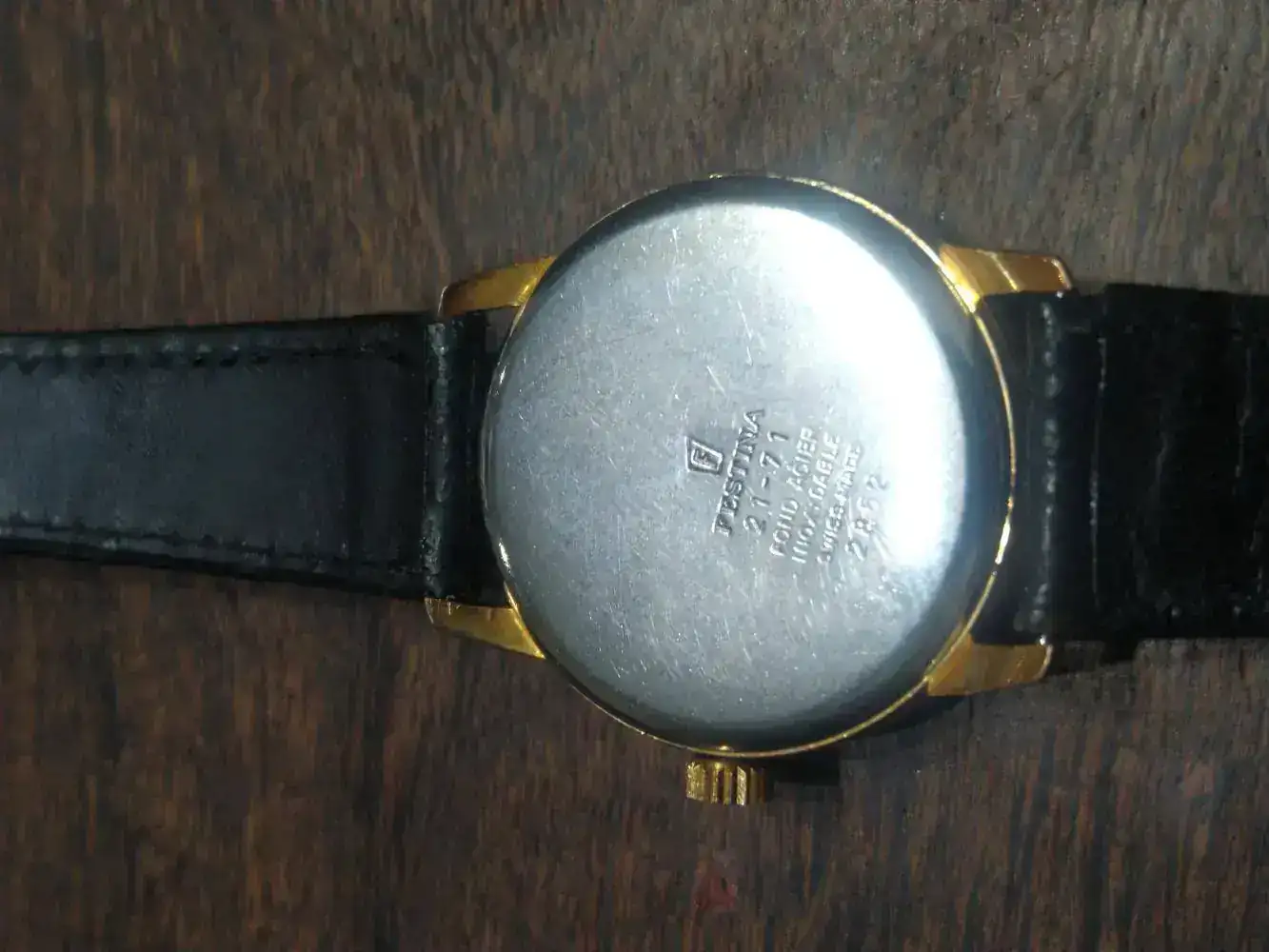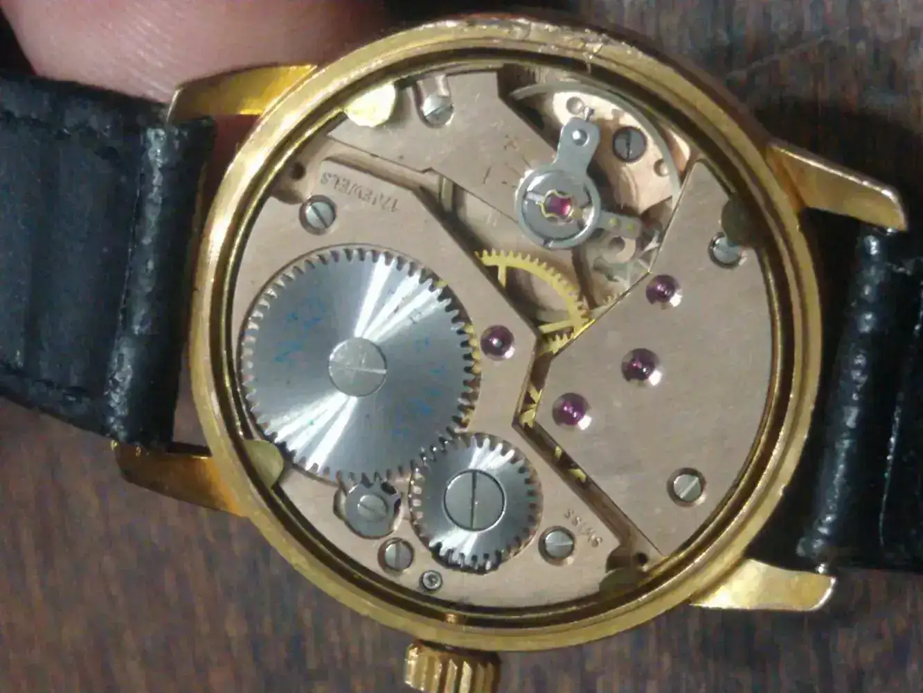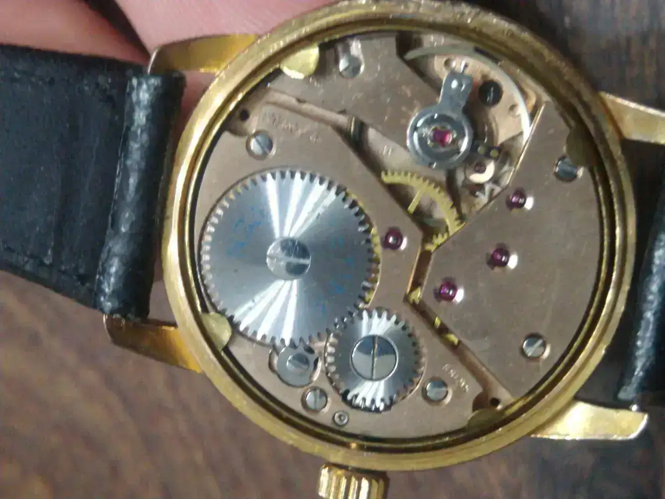 (Edito: corrijo, hay letras pintadas en los primeros 60s), le cambiaron el puente de dar cuerda, con piezas de un ETA 7001 o 6498 pintadas de otra marca.