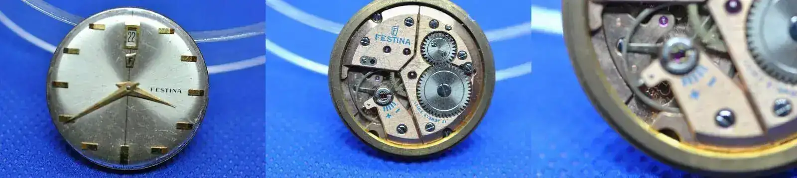 El calibre se puede confundir con un ETA 6498, pero ese trinquete situado entre rochete y la rueda de corona me lleva a pensar que es un Peseux. Aquí tienes un Peseux 320 montado en un reloj muy similar a ese Festina, un UNO de latón de primeros 60s.