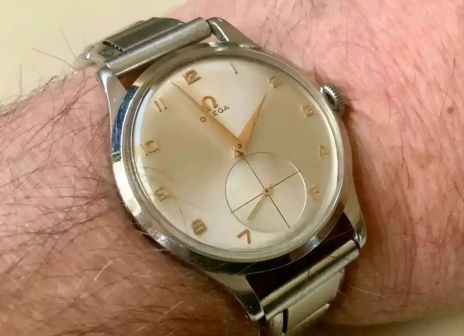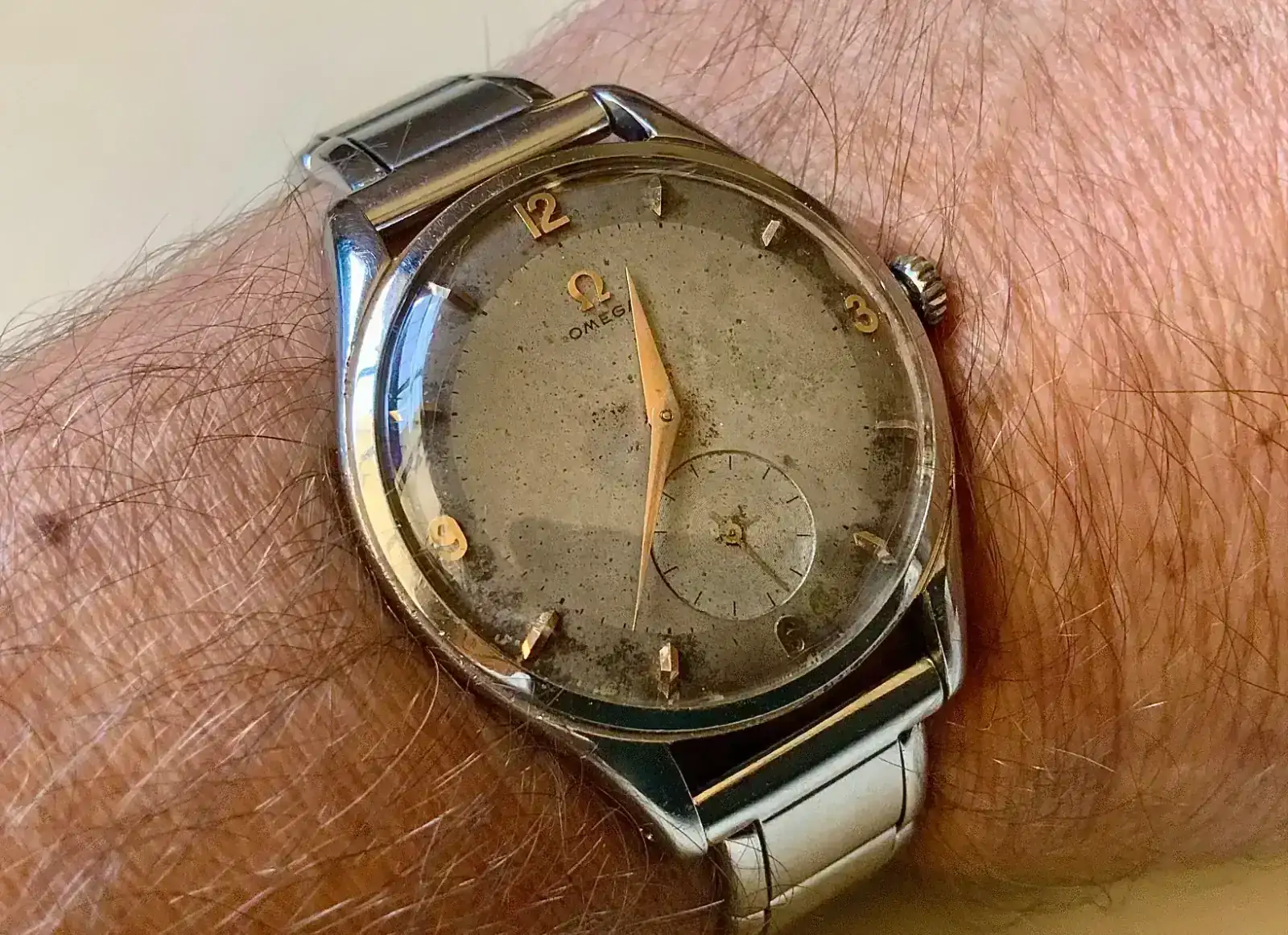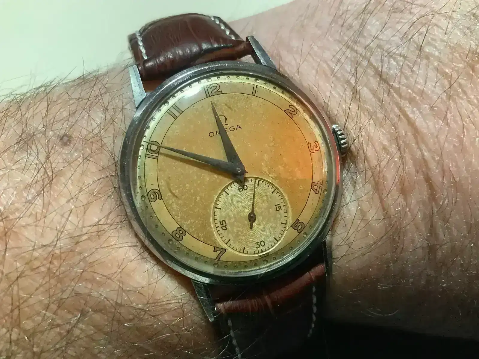 Un buen amigo ha encontrado, literalmente, en un cajón un Omega que el cree que es de la década de 1940 y de referencia 30t2 (por encontrar algunos similares en internet). El tamaño es de 36mm (con una regla, no tenía a mano un pie de rey) y se ve muy bien, excepto el brazalete, el cual me parece horroroso (estéticamente hablando).