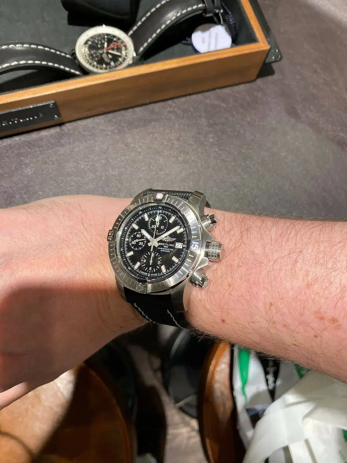 Hombre, si tienes lo suficiente poca muñeca para el explorer 36 y te gusta... No lo dudes.Ayer a última hora de la tarde estuve en ECI de Nuevos Minisiterios y Breitling era de las pocas relojeras que seguían abiertas al público, y, sin ánimo de liarme más a mi mismo, me probé un Navitimer de 41mm (me dejó frío), un Premier de 42 mm (no B01, elegante pero me dijo poca cosa), el Chronomat de 42 mm (espectacular, pero lo veo excesivo en tamaño) y, para mi sorpresa, el Avenger Cronógrafo que me resultó espectacular (43mm que creo que, desde mi punto de vista, quedaban mejor que los 42mm del Chronomat).
