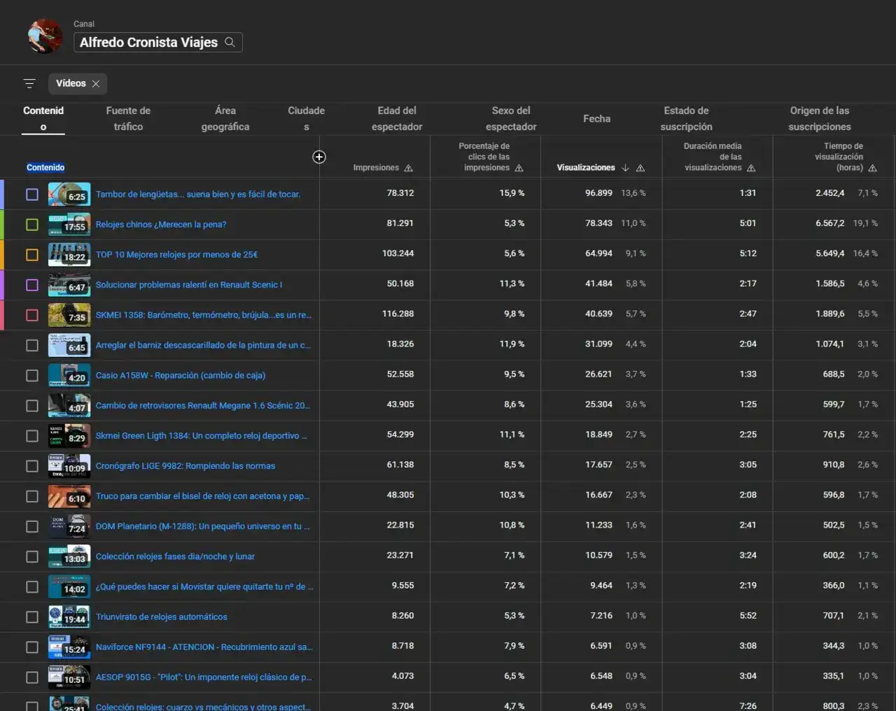Muchísimas gracias. He leído con atención todo lo que comentais. Tenía claro que el foro era la ostia pero me habéis sorprendido, no me esperaba comentarios tan extensos y de tantísima ayuda.Por si te ayuda, estas son las estadísticas de mi usuario en Youtube. Hace años que no subo nada. Puedes trabajar muchísimo un video sobre algún reloj y tener 200 reproducciones. Y haces un video sobre un tambor sin haber sido llamado por el camino de la música y tienes casi 100.000: