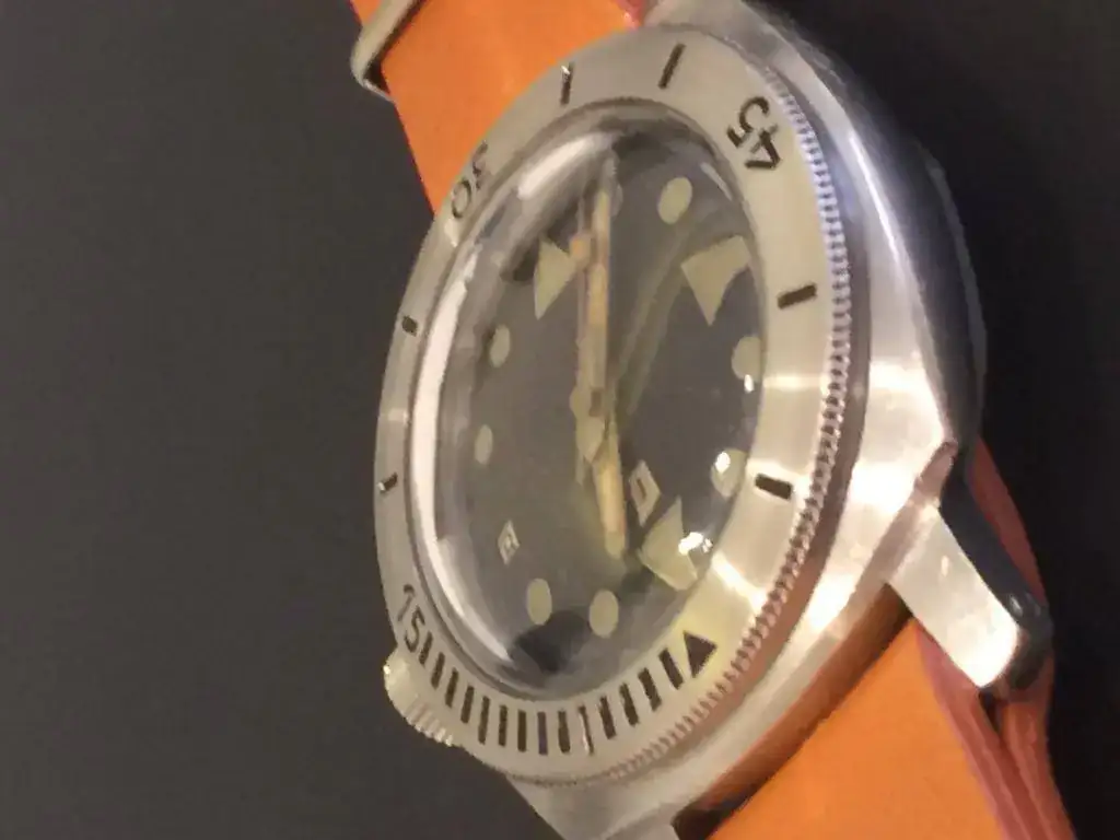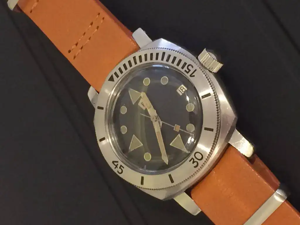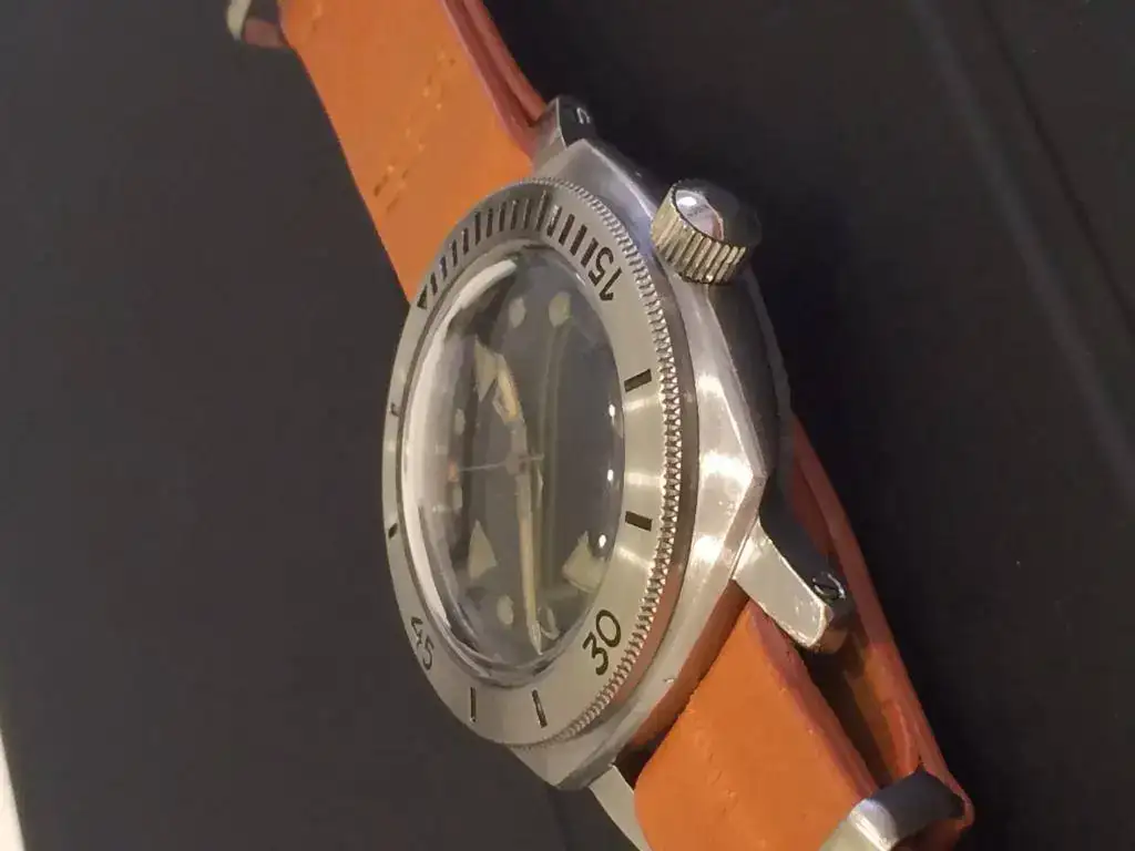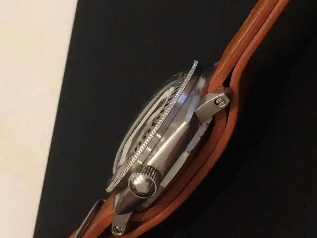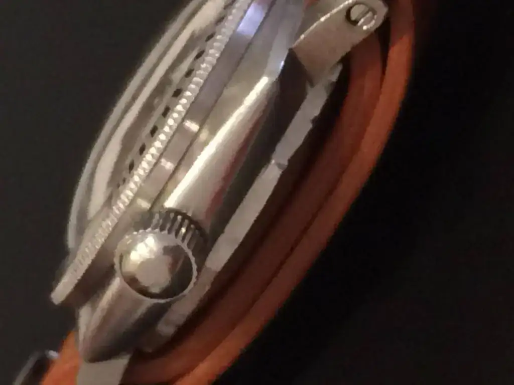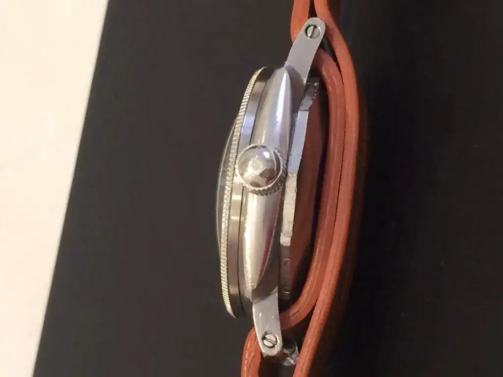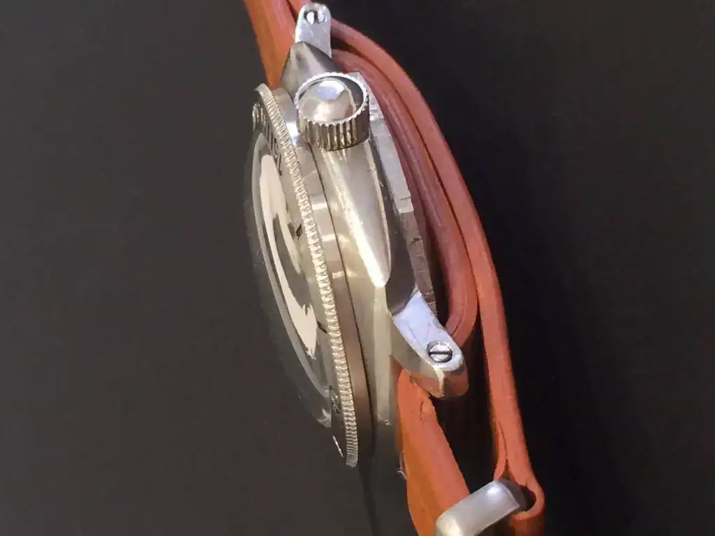 Este ultimo presento un reloj peculiar. En 38mm. Fabricado con acero sueco (era una especificacion y que conste que no tengo ni idea de aceros). Caja cojin como la 1950 de Panerai. Aunque con asas,mal igual que la caja 1940 de pam. Con pasadores a rosca, identicos a los de Panerai y que en mi caso conserva originales. Tapa y corona a rosca. Tapa de hierro dulce que lo hace antimagnetico. Cristal de plexy abombado que ademas entra por la taba y se enrosca a la caja (algo bastante curioso y que podeis ver en una foto). Y cuya maquinaria era la misma que llevaba el Tudor Submariner de la epoca.