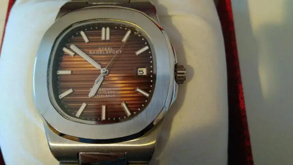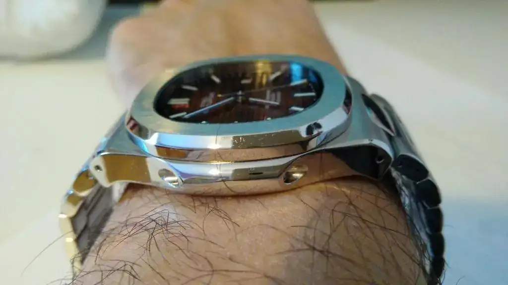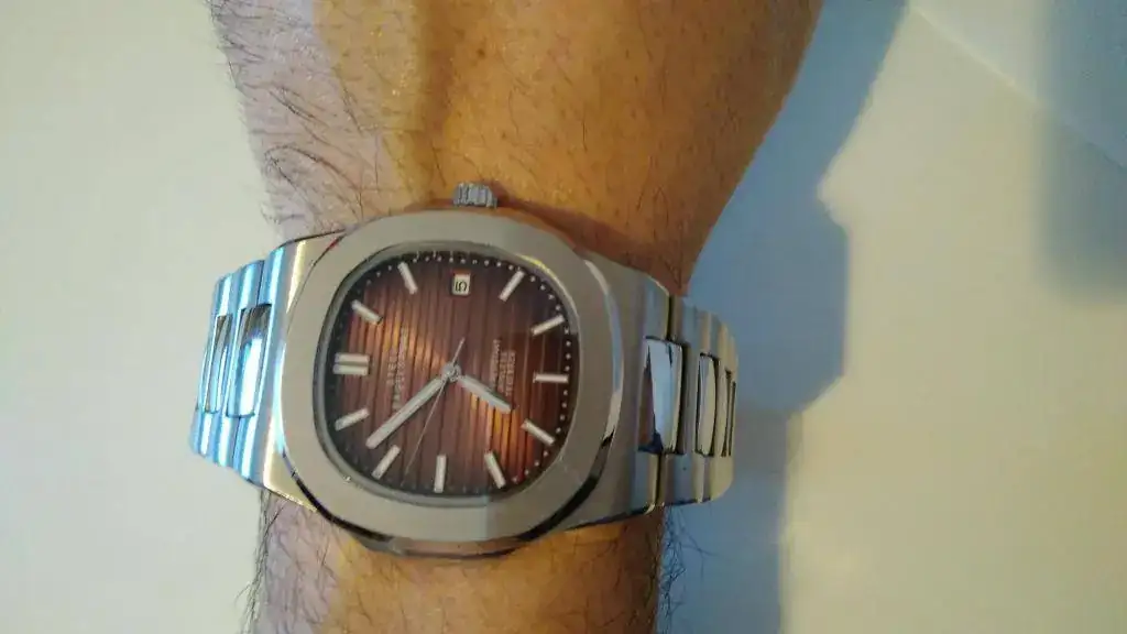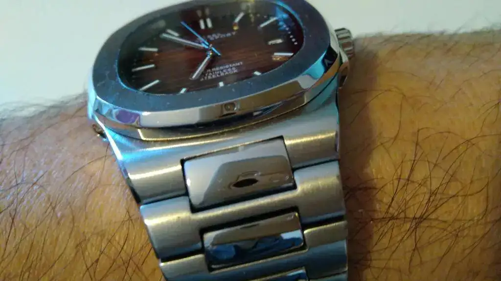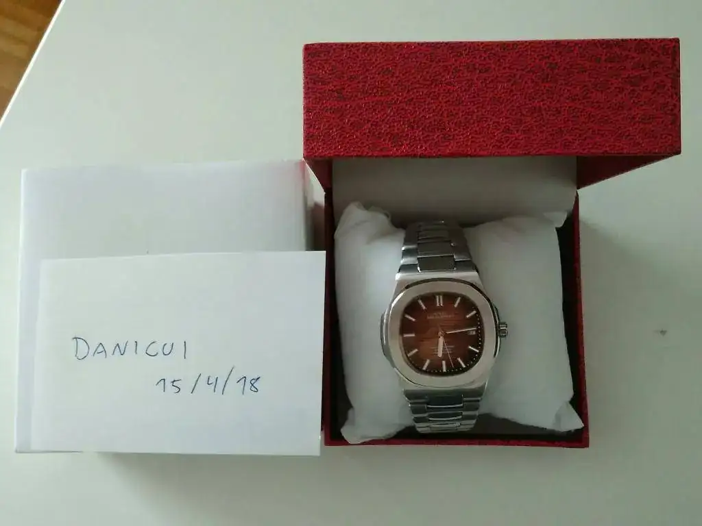 Pues aquí está este bonito "homenaje" a tan famoso reloj. Está en perfecto estado, sólo me lo he puesto para darme cuenta de algo que debo advertir para evitar malentendidos: no sé si es un defecto de fabricación o un diseño mal hecho, pero al ponérmelo se queda un hueco entre mi muñeca y la parte del armis que se une con la caja, como veréis en las dos últimas fotos, tal vez pueda forzarse un poco, o arreglarlo de alguna manera, o ponerle otra correa (parece difícil por la forma que tiene)... o si tienes una muñeca más gruesa que la mía (es de 16-17 cm...) a lo mejor no te deja el hueco.
