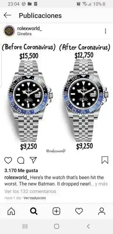 .Hola. He leído que debido al coronavirus, los precios de relojes de alta gama tal como el rolex batman nuevo han bajado, en este caso, casi 3000 euros. ¿Es esto verdad?