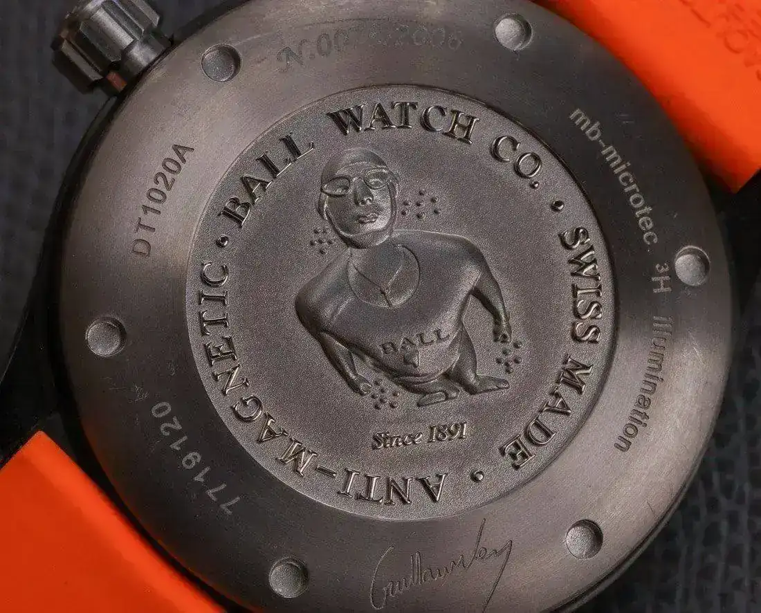 Ball ofreció el TMT en tres colores de esfera diferentes, incluido este modelo azul y naranja profundo; así como en blanco y negro, y azul y amarillo. La caja es de 42 mm de ancho con orejetas gruesas, por lo que se asienta modestamente en la mayoría de las muñecas, tiene poco menos de 15 mm de grosor, y es resistente al agua hasta 300 m. Sobre la esfera hay un cristal de zafiro ligeramente abovedado que está recubierto con AR no tiene demasiado brillo y la luminosidad de los índices es muy buena gracias al tritio. Se hicieron series limitadas de 1000 y 2000 ejemplares a partir de los 2.300 € hacia arriba.
