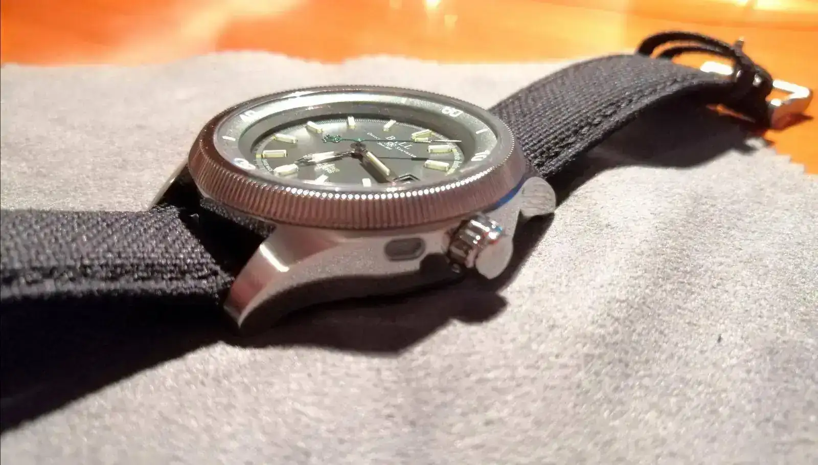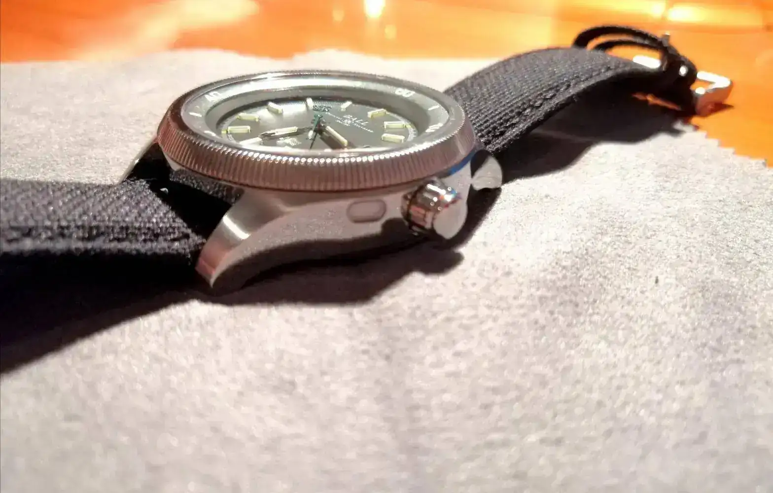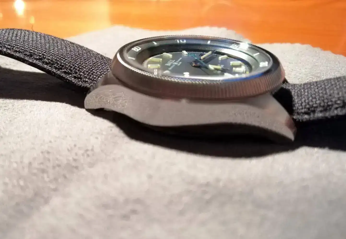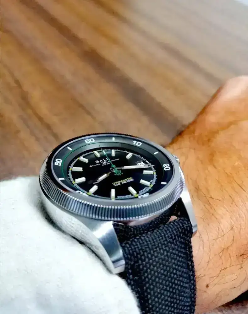 Se trata de un reloj con una calidad y nivel de detalles excepcional. Mide 42mm de diámetro con un bisel interior generoso, que va descendiendo hasta llegar a la esfera principal. Ancho de asas de 21mm, altura de caja de 12,9mm. La distancia entre las asas superiores e inferiores es de 48mm. En general, unas medidas contenidas. Los índices numéricos del bisel interior están recubiertos de luminova. Los índices de la esfera principal así como de las agujas son los famosos tubos de tritio que emplea Ball, sobreelevados en la esfera y agujas, que se iluminan en color verde, salvo la horaria, minutera y el índice de las 12, que lo hacen en color amarillo.