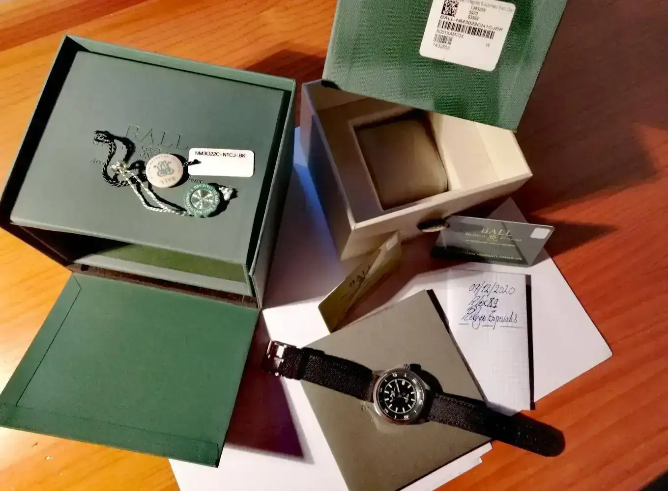 Se entrega con toda su dotación original, correa original con su hebilla original firmada por Ball. Tarjeta de certificado cronómetro y de garantía, esta última sin firmar. Caja interior, exterior y sobrecaja. Los dos lacres del reloj con su número de serie y cartón donde se alojan las tarjetas mencionadas. Todo ello en un estado impecable.