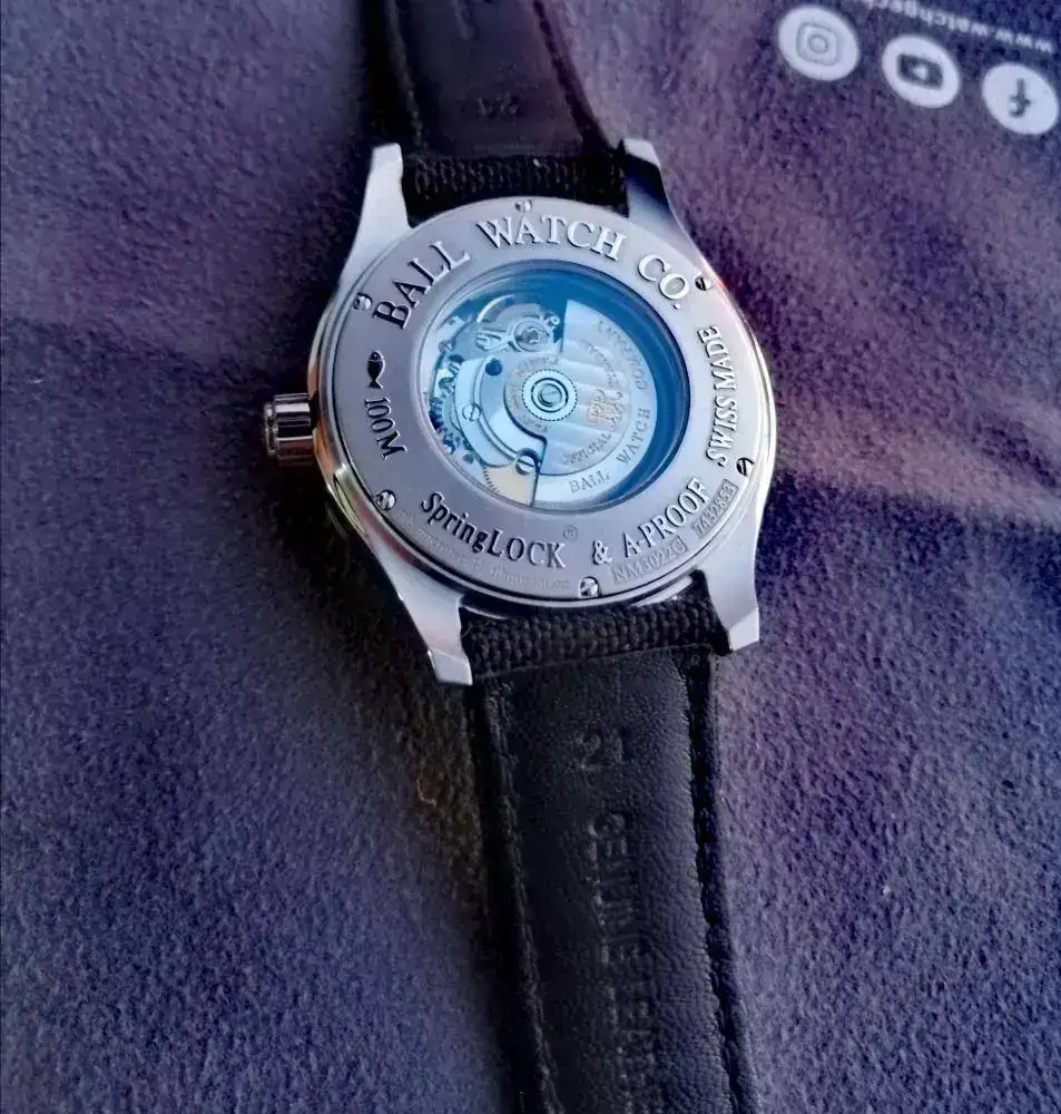 Esta Pieza monta el calibre automático Ball RR 1103-CLS con certificado cronómetro muy bien decorado. Al que Ball le añade el sistema patentado por Ball llamado “Spring lock” que protege la espiral con una jaula que reduce la desviación de la misma en caso de golpes, el cual aumenta de manera soberbia su resistencia a golpes sin resentirse su precisión. Gracias a este sistema, es posible realizar con el reloj actividades como por ejemplo golf.