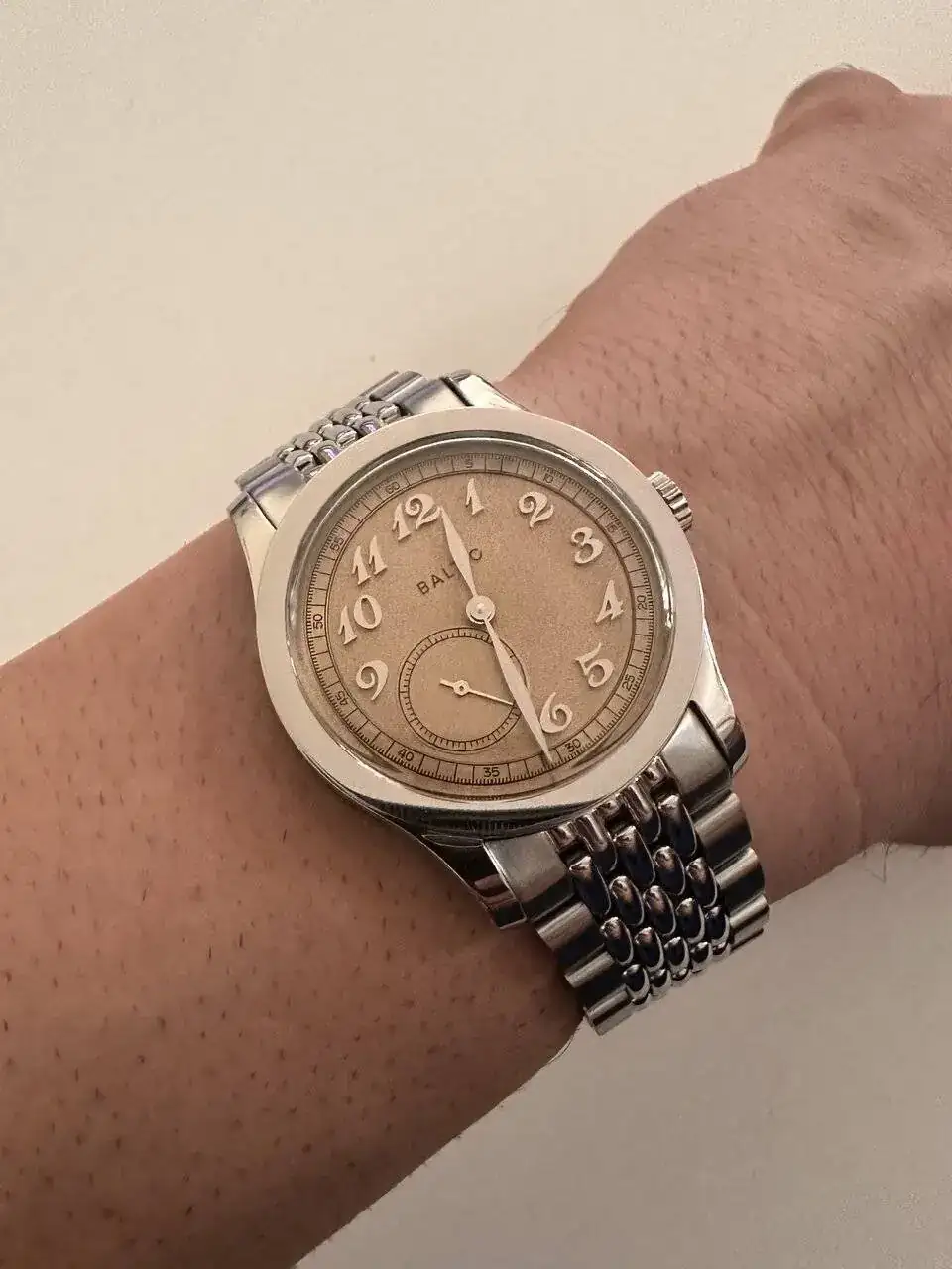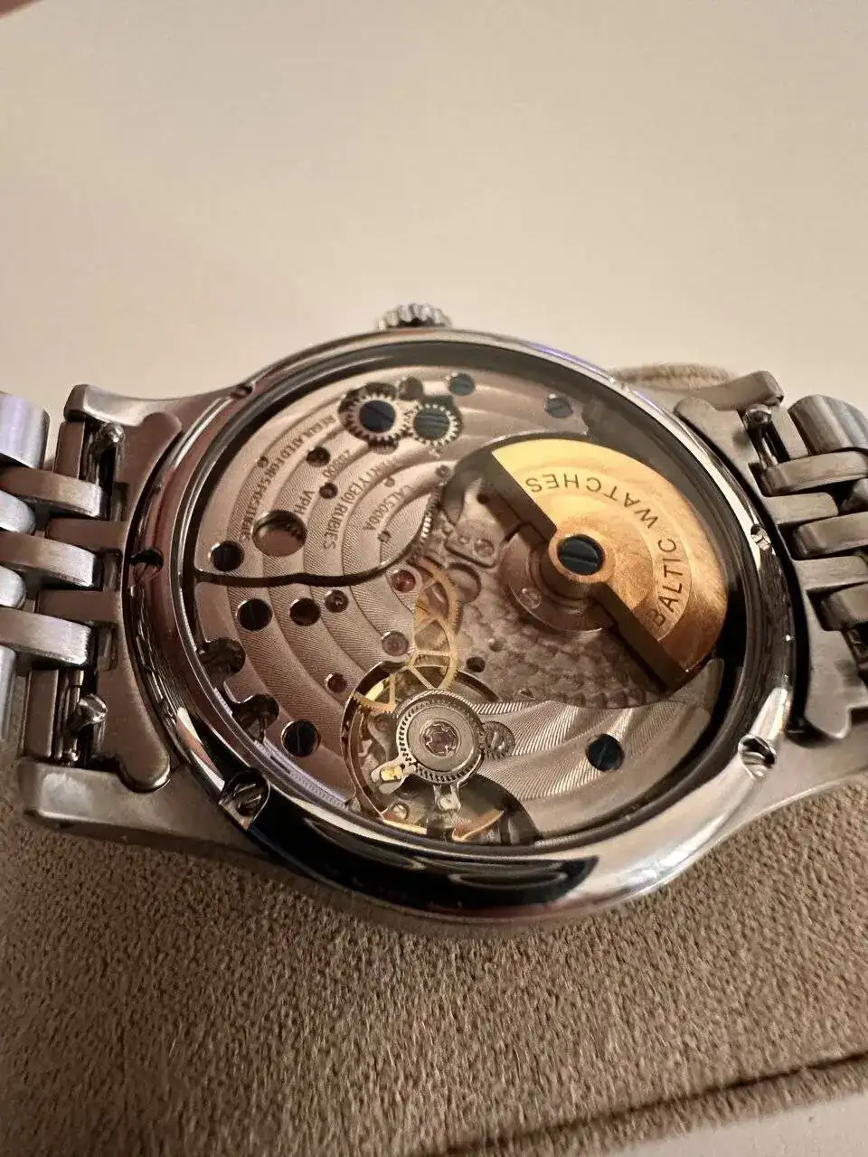 Muy buenas a todos os presento el último en llegar, esta vez quería dar un toque formal a la colección para celebrar la pedida de mano con mi pareja. Se trata del Baltic mr 01 con fondo salmón con su movimiento Automatic Hangzhou CAL5000a Micro-rotor una caja de 36 mm, que puesto en muñeca no da esa sensación de ser tan pequeño al menos en las primeras sensaciones creo que es debido a sus asas de 20mm. Trasera vista en lo que en mi opinión le da un toque muy bonito, una reserva de marcha de 42horas.