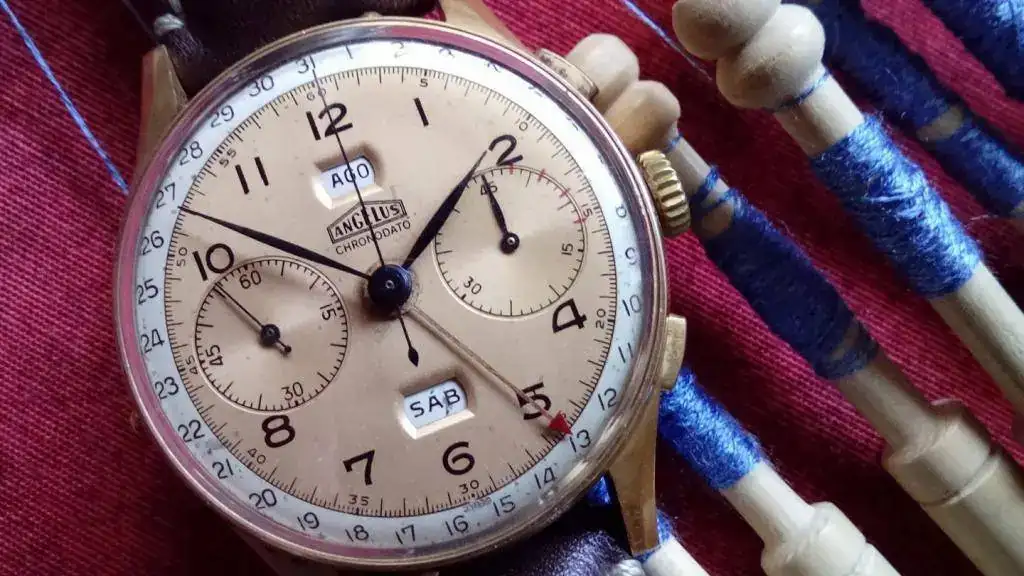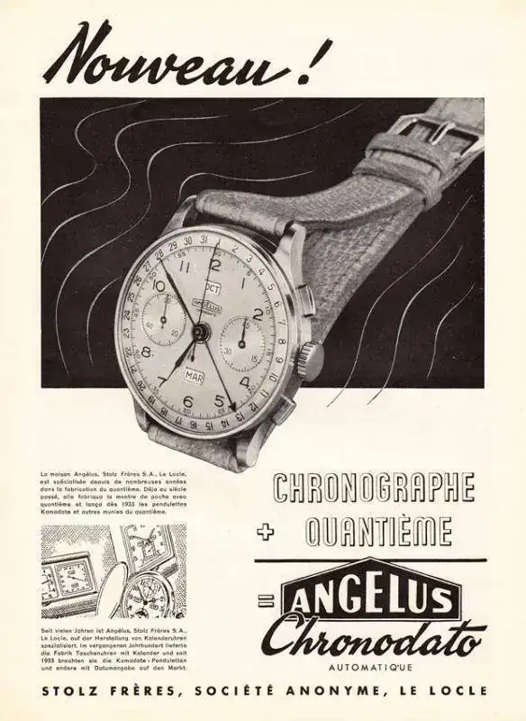 Pero para que el señor moderador no me pase este post al O.T. les presento este Chronodato Ángelus, acomodadito con unos bolillos, hacen linda parejita, no?. Con una característica, creo especial, miren la tipografía de Chronodato en su cuadrante, no tiene la tradicional cursiva bajo el logo de Ángelus, es en este caso letra de molde, yo siempre pensé que era un mal restampado, pero la impresión es original, así que por favor comparen con esta vieja publicidad de chronodato Ángelus. ( usen el zoom) Que opinan ustedes?.