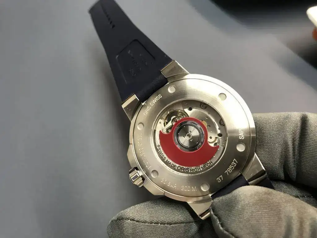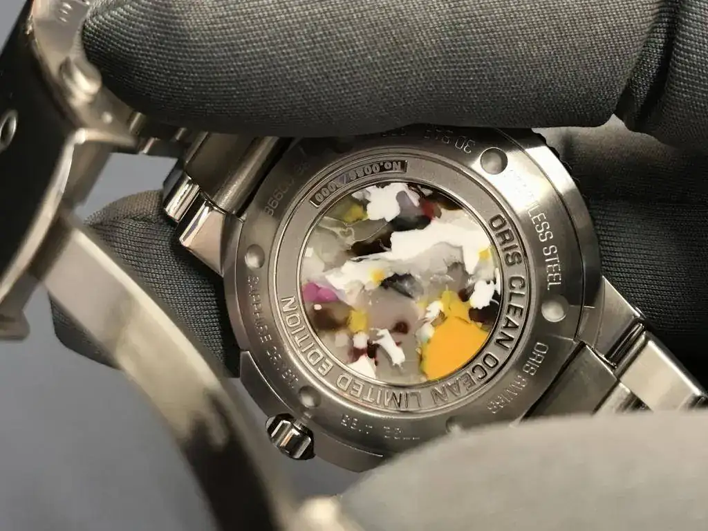 Dos mil relojes de la serie Aquis, de 39,5 mm de diámetro, con esfera azul intenso, movimiento Sellita (rebautizado Oris 733), 300 metros de resisitencia al agua y un fondo ciego decorado con partículas de ese plastico que se quiere eliminar, lo que hace a cada reloj único. Precio con armis, 2.050 €