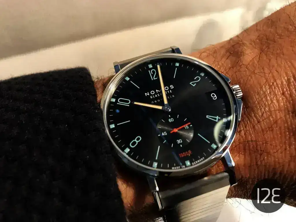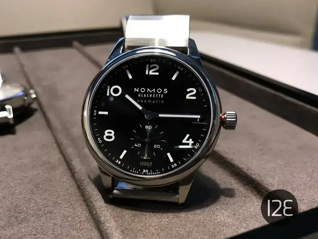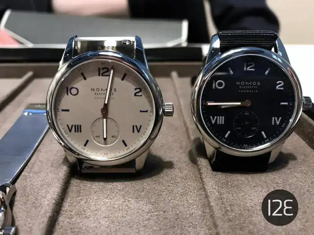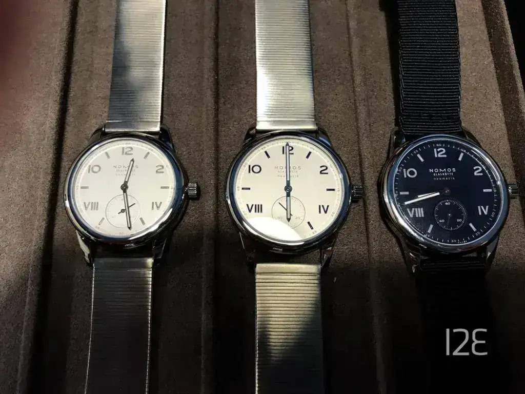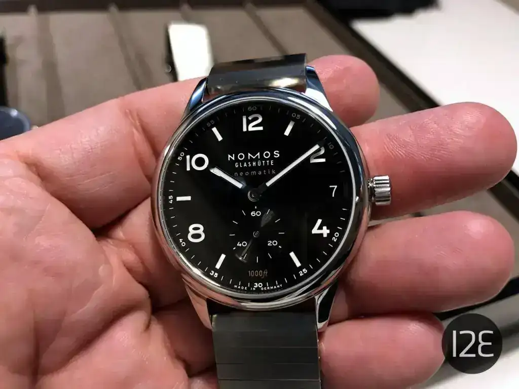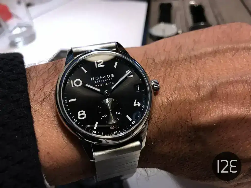 Finalmente, los que más me gustaron, los Club Sport, con una resistencia al agua de 300 metros (1000 pies) en una caja de ¡42 mm! Toda una enormidad para Nomos. El calibre vuelve a ser el admirado (al menos por mí DUW 6101 con fecha "a prueba de torpes", que se puede ajustar en cualquier momento hacia adelante y hacia atrás. Detalle estético: esa fecha queda pegadita al borde exterior de la esfera, lo que da la sensación de "llenado" de la caja por el calibre. Otro detalle: el tubo de roscado de la corona es de color rojo, lo que sirve de aviso cuando la corona no está roscada del todo. Llevará de serie el nuevo brazalete metálico recién diseñado por la marca y que personalmente me parece demasiado separado de la caja.