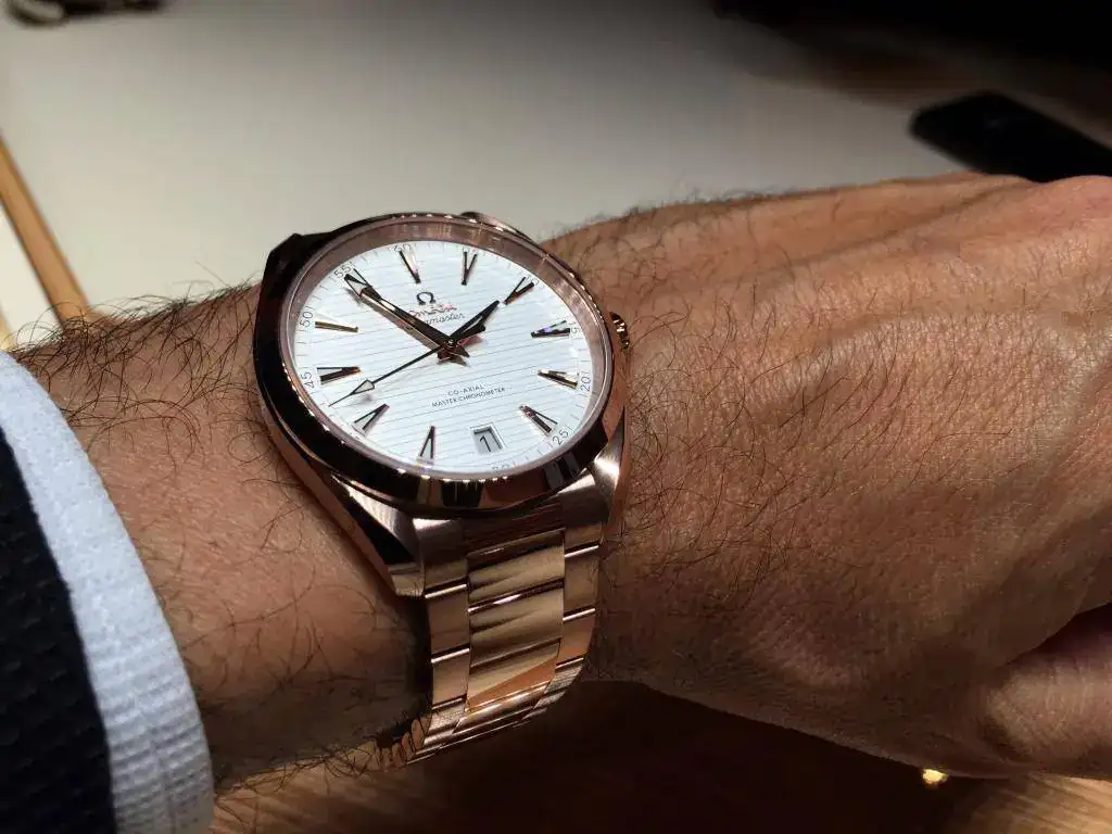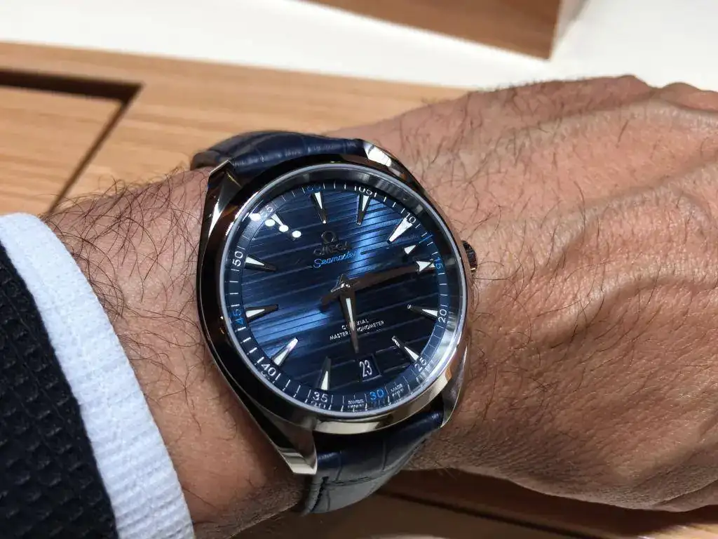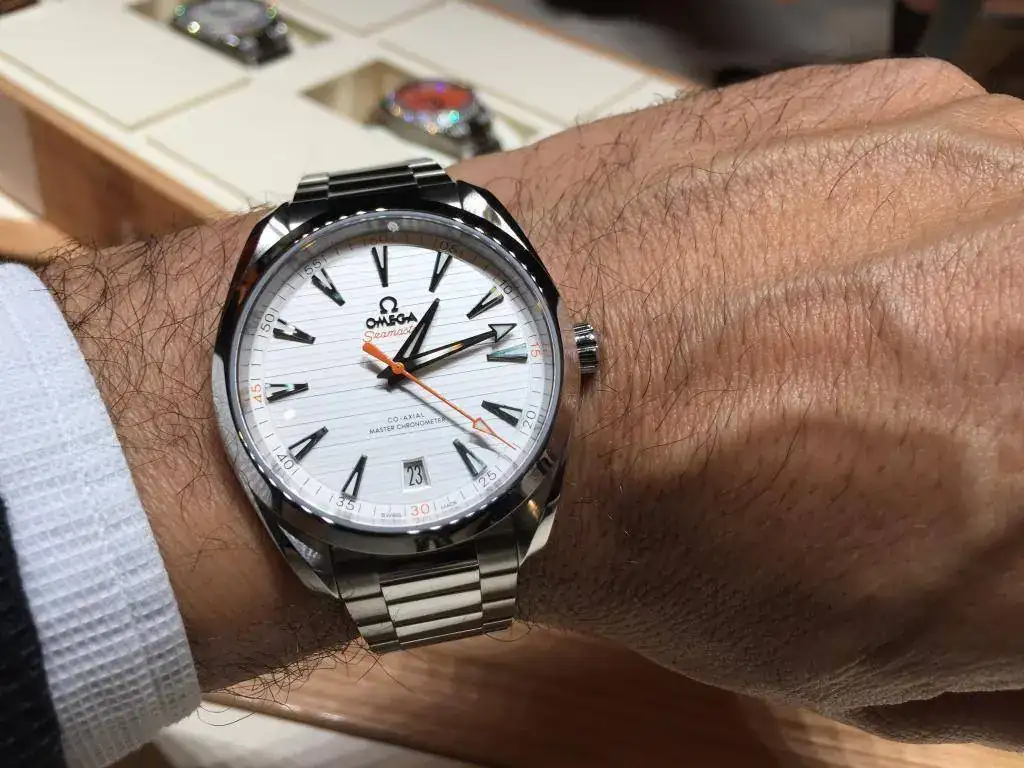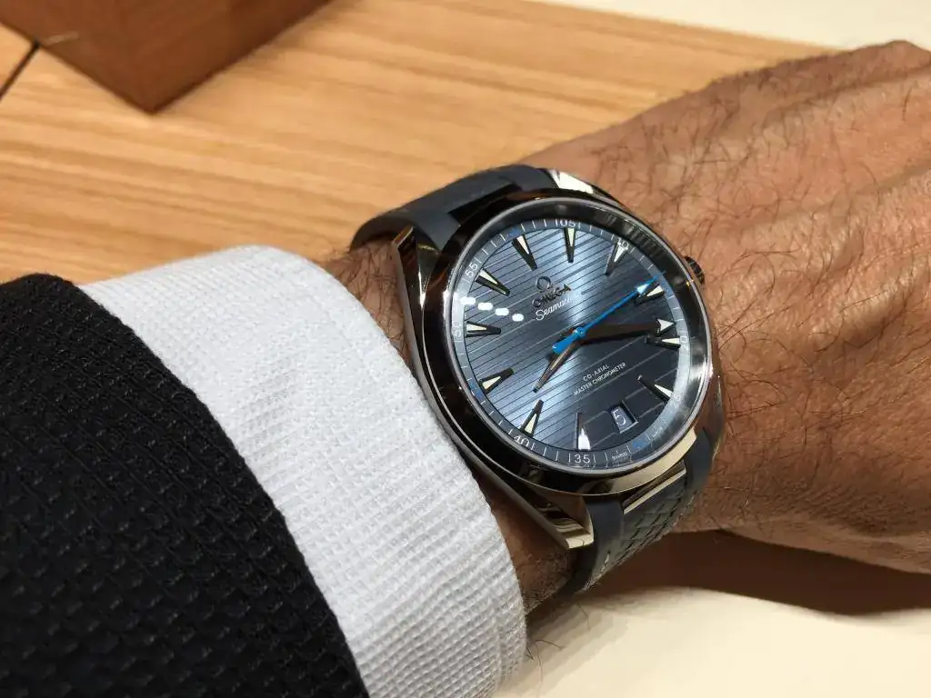 Empezamos or el Aquaterra de 41mm, que ha sido completamente remodelado. La caja es ahora simétrica cuando en el diseño anterior había un lijero abombamiento en el lado derecho para proteger la corona. Además, las "côtes" de la esfera (que buscan simular la teca de las cubiertas de los barcos) pasan de una orientación vertical a horizontal; casi parece otro reloj. No sé si las tenía ya, pero esas asas me recuerdan mucho al Speedy. Pero la novedad más importante es que montan el calibre 8900 con certificado cronométrico del METAS, lo que les da la calificación (auto-otorgada) de Master Chronometer.