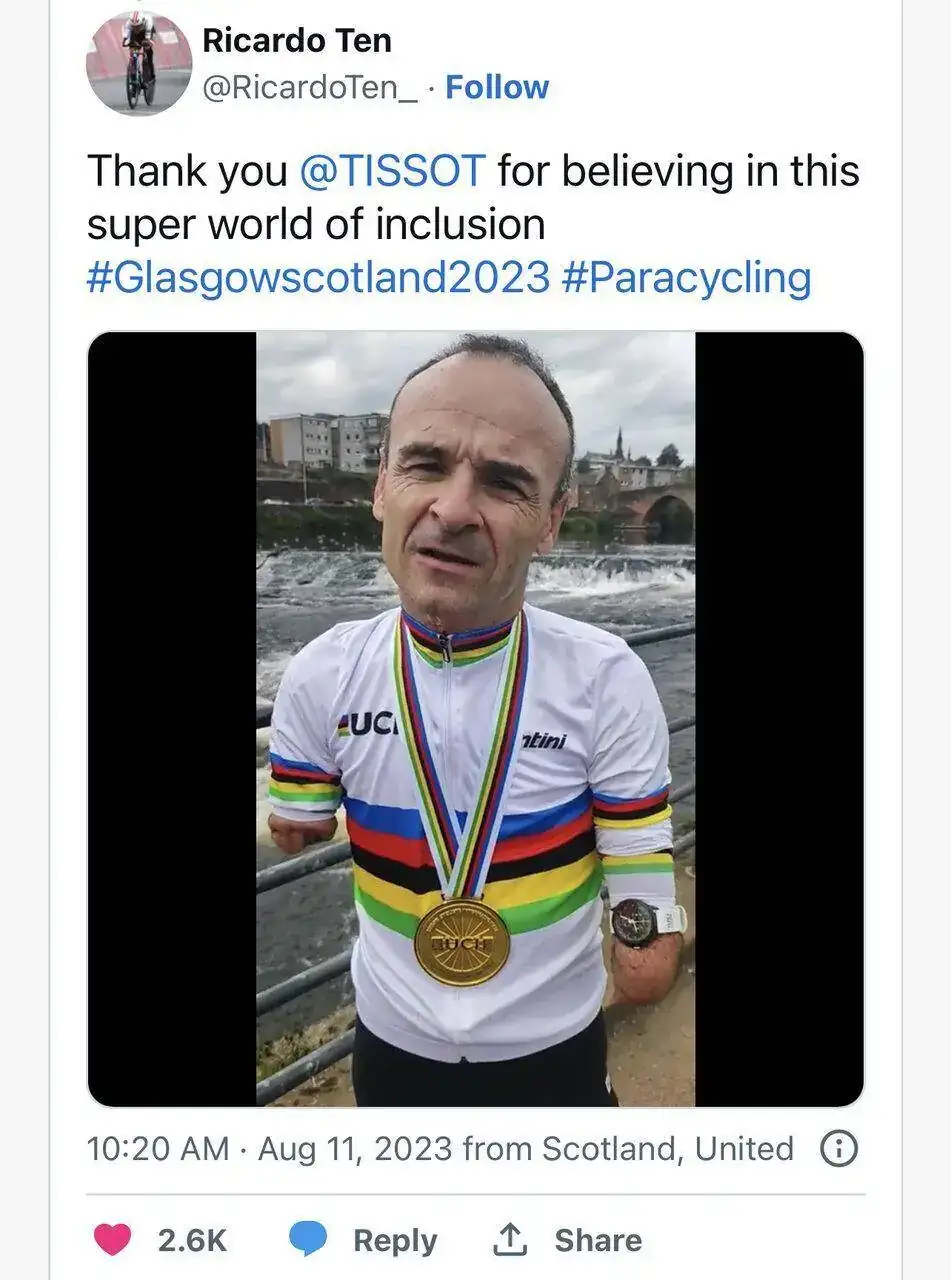 Efectivamente, que decida él donde se pone el reloj, como si quiere ponerselo en un tobillo o colgarlo con la medalla. ¿La alternativa hubiera sido no darselo por no tener muñeca?Pues el protagonista de la noticia tiene muchos menos prejuicios que algunos, y ha agradecido efusivamente a Tissot no haber hecho discriminación alguna: