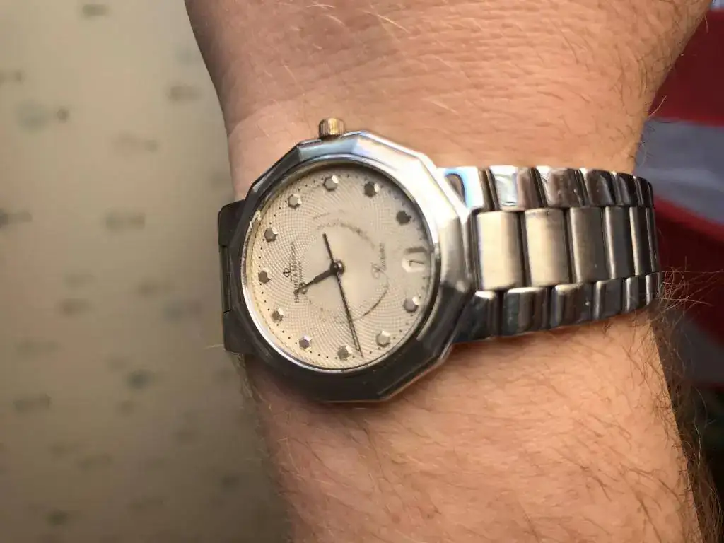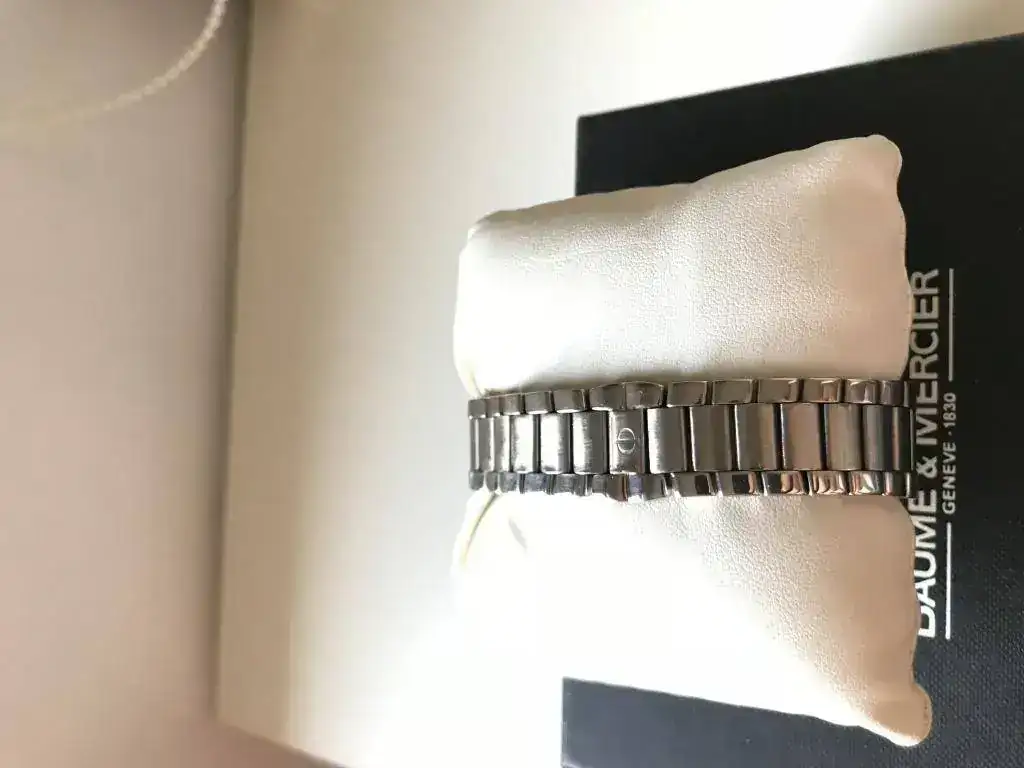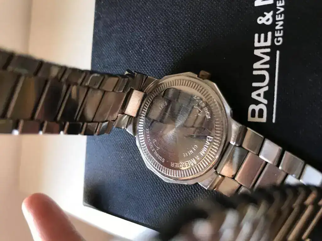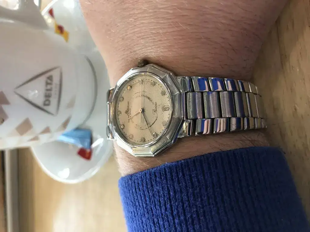Buenas noches! Me gustaría conococer vuestra opinión acerca de mi Baume & Mercier. Se trata del modelo 5131 Riviera de cuarzo, con diámetro de 34 mm sin contar la corona y dial marcado como veis. Personalmente el reloj me gusta y lo uso pero de forma un tanto esporádica. La cuestión es que la marca del dial lo afea bastante y no soy capaz de conseguir una corona que le encaje mejor que la que presenta actualmente y que no es la suya. Lo llevé a un relojero, lo revisó con cepillado y pulido pero me dijo que la marca del dial no podía quitarla que habría que restaurarla y eso él no lo hacía, podía enviarla a un sitio en Madrid pero por 130€ aproximadamente. Me gustaría conocer vuestra opinión sobre el reloj y que valorarais la calidad del cepillado y pulido y si consideráis que la pieza es ponible a pesar del marcado del dial. Sabéis dónde puedo encontrar una corona que le encaje aunque no sea la original?