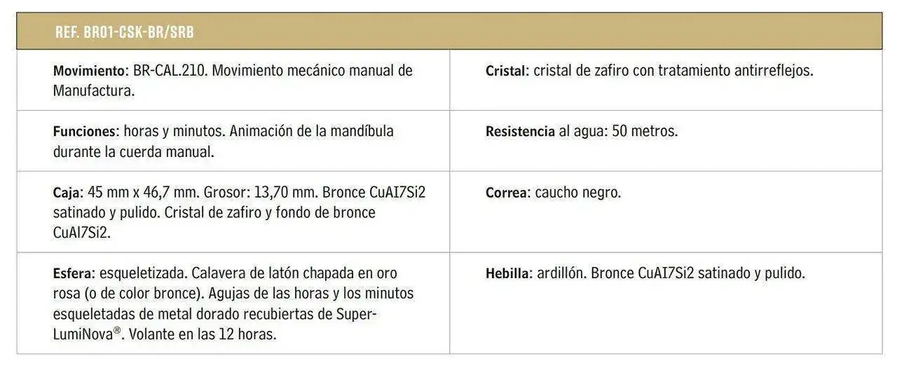 Para este reloj se ha desarrollado específicamente el calibre BR-CAL.210, 100% manufactura. Su cuerda manual activa una pieza autómata. Al girar la corona, la mandíbula de la calavera cobra vida, haciendo que parezca reírse en la cara de la muerte. A la complejidad de "ocultar" todo el mecanismo detrás de la calavera y las tibias (que no fémures) cruzadas se une el homenaje a la tradición de autómatas del siglo XVIII. Los extremos relojeros se tocan.