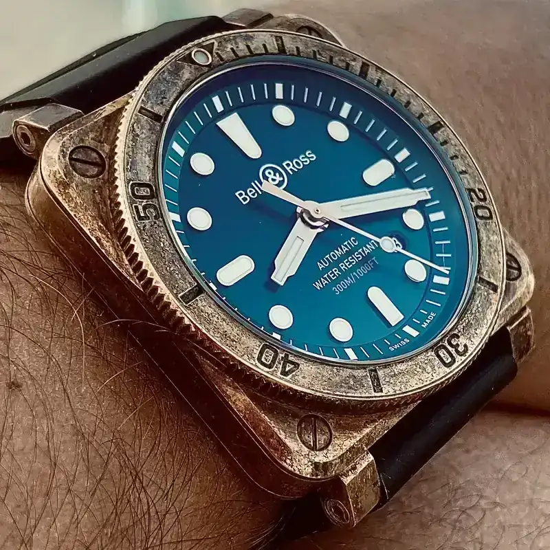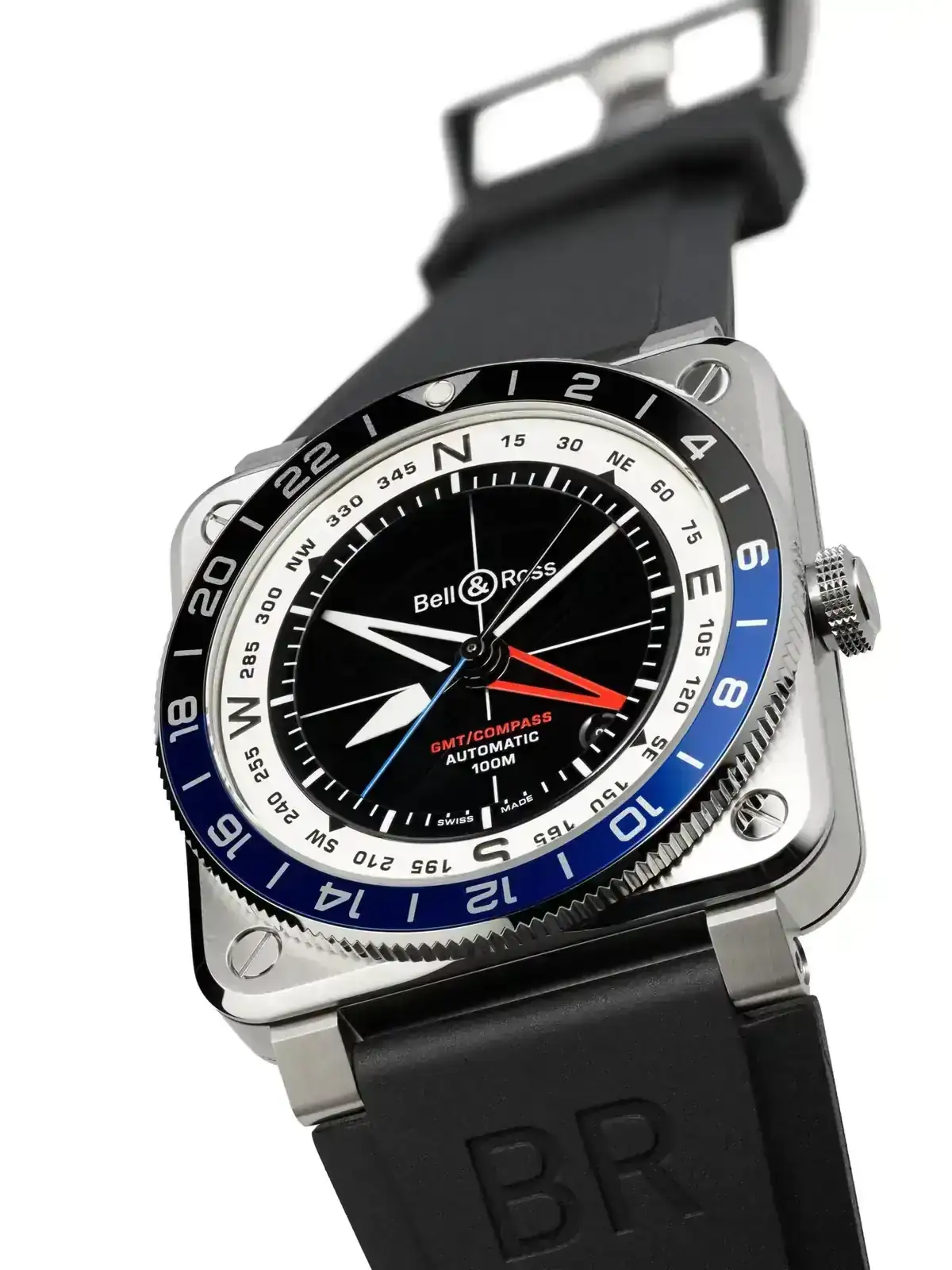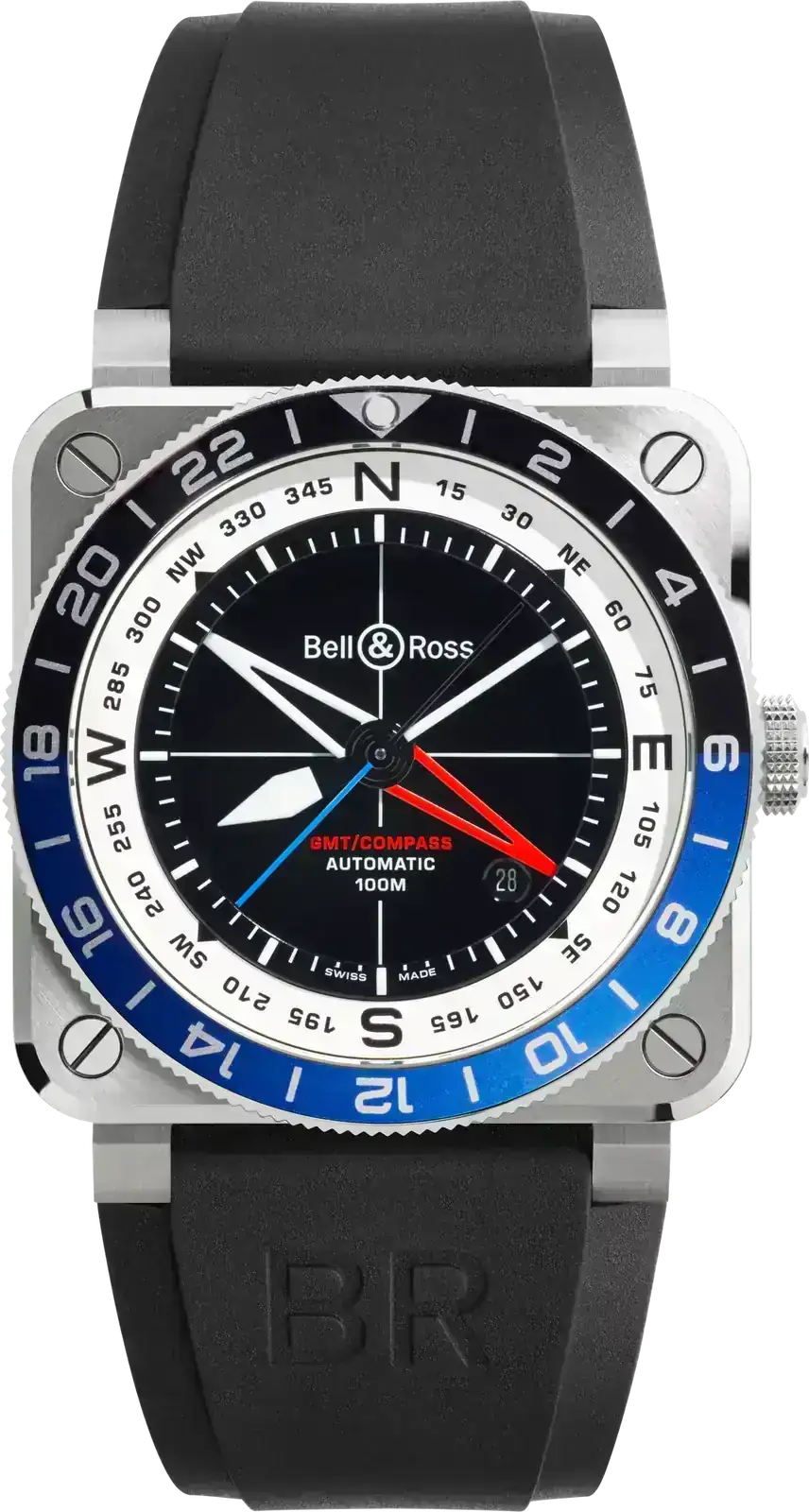 el motivo de la brújula en la esfera del nuevo BR-03 GMT Compass no es meramente decorativo. Con su escala graduada, cumple una auténtica función de navegación. En un día soleado, puede utilizar fácilmente su reloj para orientarse, gracias a la combinación de la graduación de la rosa de los vientos y la aguja GMT de 24 horas que indica la segunda zona horaria. Esta aguja GMT tiene forma de diamante, igual que la aguja de una brújula magnética tradicional. Los cuatro puntos cardinales (norte, sur, este y oeste) están marcados en el realce a las 6, 12, 18 y 24 horas.