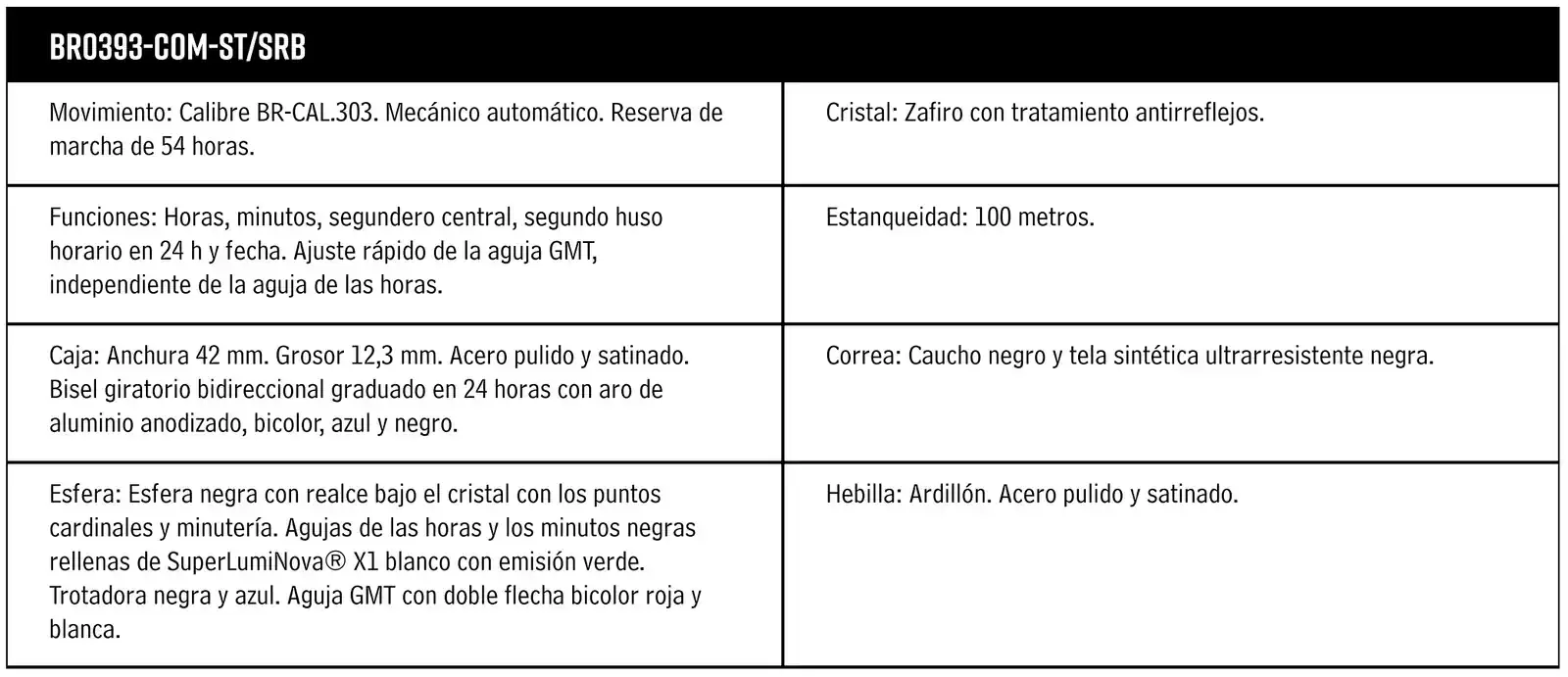 Este nuevo modelo se basa en el reciente BR 03-93 GMT. Muy legible y fácil de usar, es hermético hasta 100 metros y cuenta con un bisel de aluminio anodizado graduado en 24 horas. La sección azul muestra las horas diurnas, mientras que el segmento negro indica las horas nocturnas.