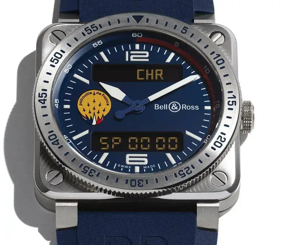 El movimiento es el calibre de cuarzo suizo BR-103. Reloj de cuarzo multifunción con pantalla digital analógica. Las funciones son: Pantalla analógica permanente: horas y minutos. Activación/desactivación de la pantalla digital: 1/100 de cronógrafo y tiempos de vuelta, cuenta atrás, segunda zona horaria, alarma, calendario perpetuo. Elección de idiomas, francés, inglés, español o alemán.