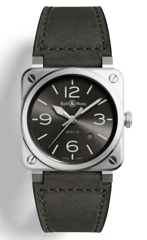 El diseño del BR03-92 GREY LUM encarna el espíritu de los relojes-instrumento. La caja retoma el concepto de «círculo en un cuadrado», seña emblemática de identidad de la casa Bell & Ross, en referencia a las siluetas de los relojes de la cabina de un avión. El reloj está equipado con una correa de piel de becerro aterciopelada en color gris y verde, que recuerda a los tintes verdosos de la Superluminova® C3. Una correa de tejido ultrarresistente con cierre de velcro negro completa la dotación del BR03-92 GREY LUM