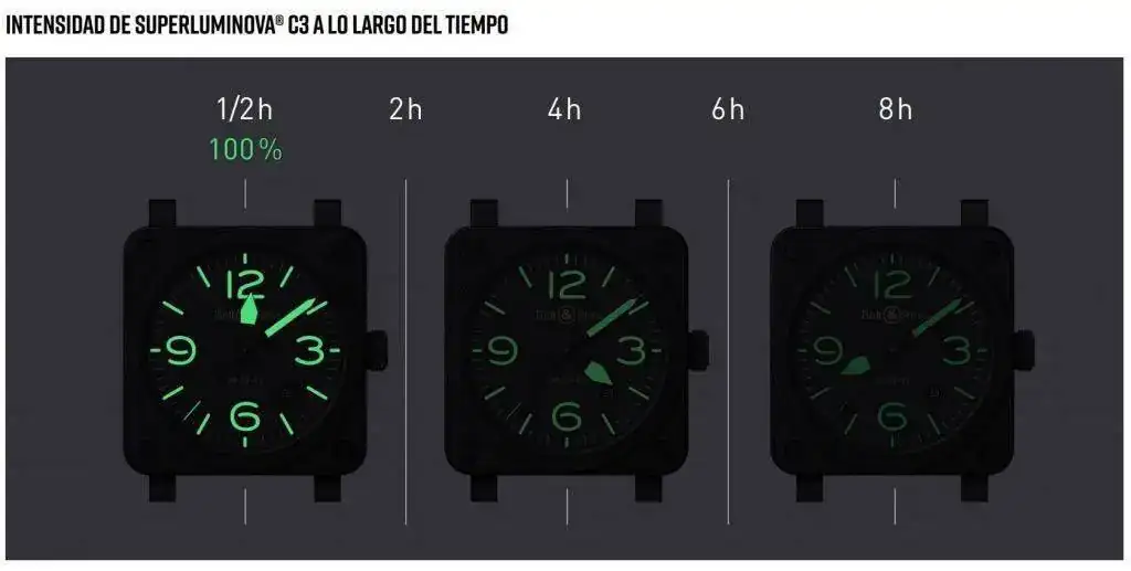 La Superluminova® C3, que recuerda a uno de los tonos mates más históricos, el del tritio de los relojes vintage militares, no se degrada con el tiempo, no presenta de forma evidente perjuicio alguno relacionado con la radioactividad y conserva con constancia su color diurno. Es más, los ciclos de carga y descarga de su luminosidad se suceden indefinidamente sin alterar en ningún momento su eficacia. De impresionante potencia, la Superluminova® C3 recarga rápidamente su fotoluminiscencia y presenta características excepcionales de intensidad luminosa. Por si fuera poco, la restitución de la luz en las agujas, los índices y las cifras dura mucho más que otros tipos de Superluminova de uso común en el mercado, con una conservación sin igual de la fotoluminiscencia.