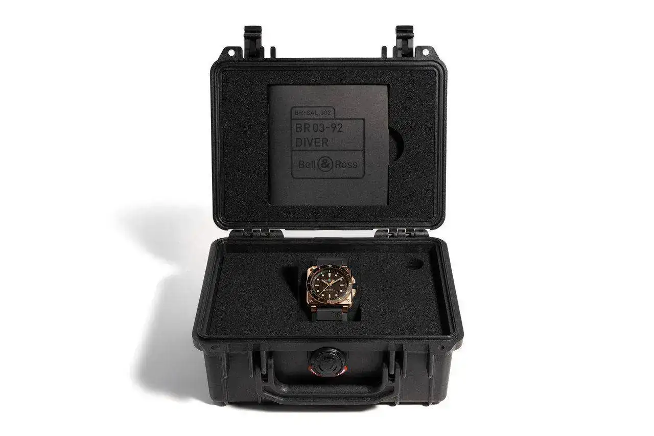 En cuanto al BR 03-92 Diver Brown Bronze, es ya la quinta iteración de color en este tipo de caja, tal vez mi preferida en la extensa colección de Bell & Ross. Este modelo viene acompañado de una caja Pelican que, si bien sería del todo innecesaria en lo tocante a estanqueidad, protegerá al reloj de golpes en las mudanzas y tal vez justifique el incremento de 300 € frente a algunas versiones de bronce anteriores. Igual que ellas, es una edición limitada a 999 ejemplares