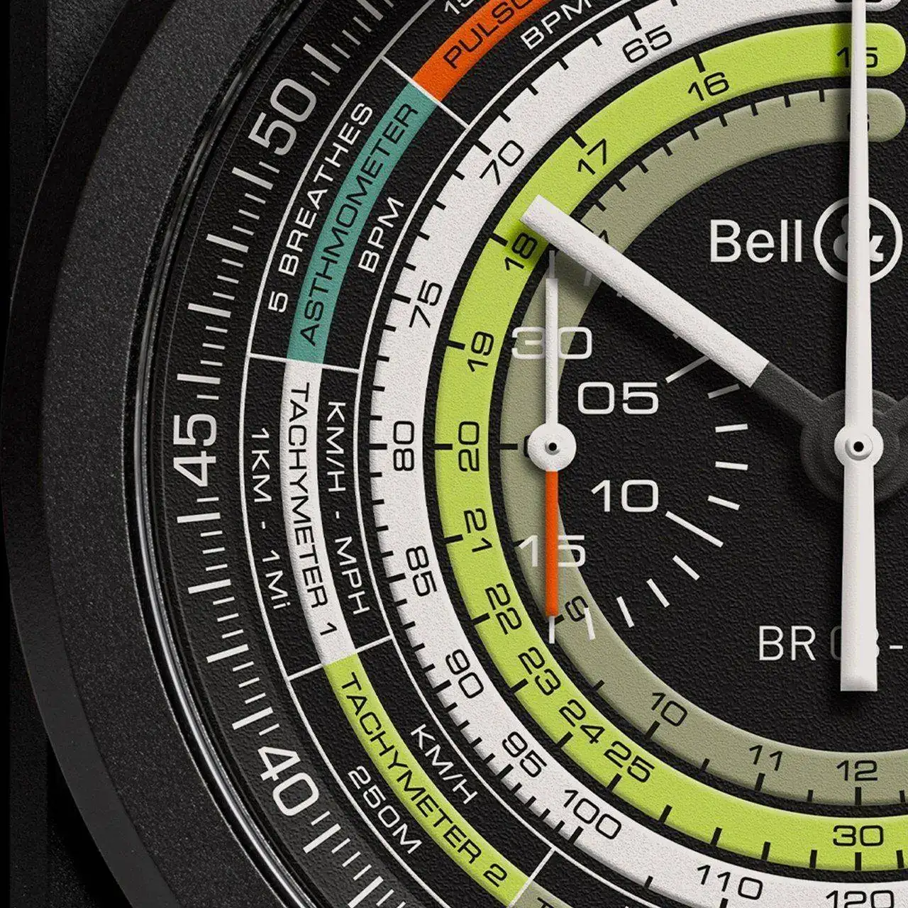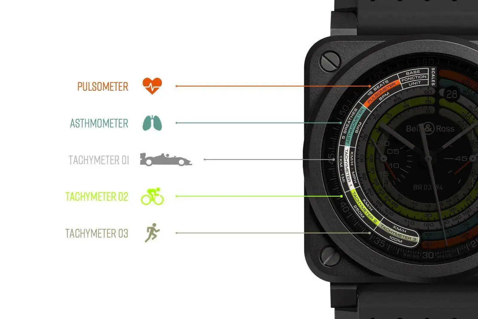 El BR 03-94 Multimeter representa una especie de instrumento de última generación. Puede ser adecuado para correr, montar en bicicleta, así como para conducir. Con esta novedad, Bell & Ross se dirige a un gran número de deportistas. Dos contadores adicionales en la esfera completan la indicación del cronógrafo. El situado a las 9 horas indica los minutos del temporizador, mientras que el situado a las 3 horas muestra los segundos.