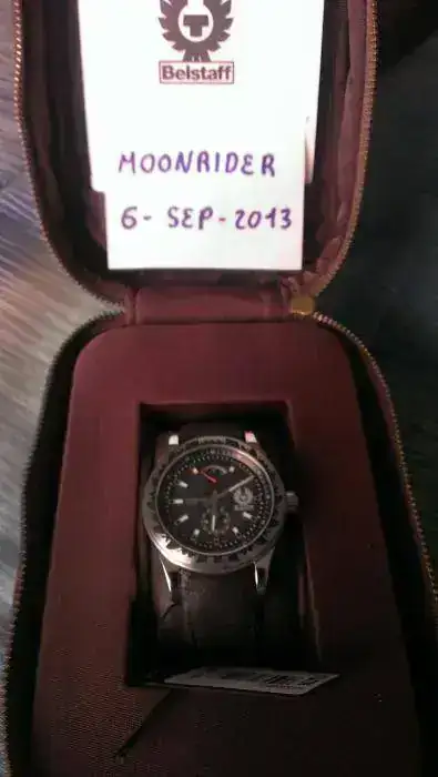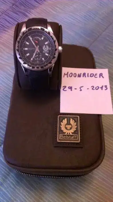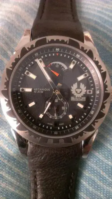 Hola, ahora le toca el turno a este Belstaff Swiss Made, elaborado por la casa relojera Lorenz. Caracteristicas: 42mm de caja, corona a rosca, WR100m, Fondo ciego con grabado de la marca y tapa a rosca tambien, cristal de zafiro y monta una Eta Pesseux 7001 con la complicacion de reserva de marcha implementada en la esfera como si fuese el medidor de un deposito de combustible.