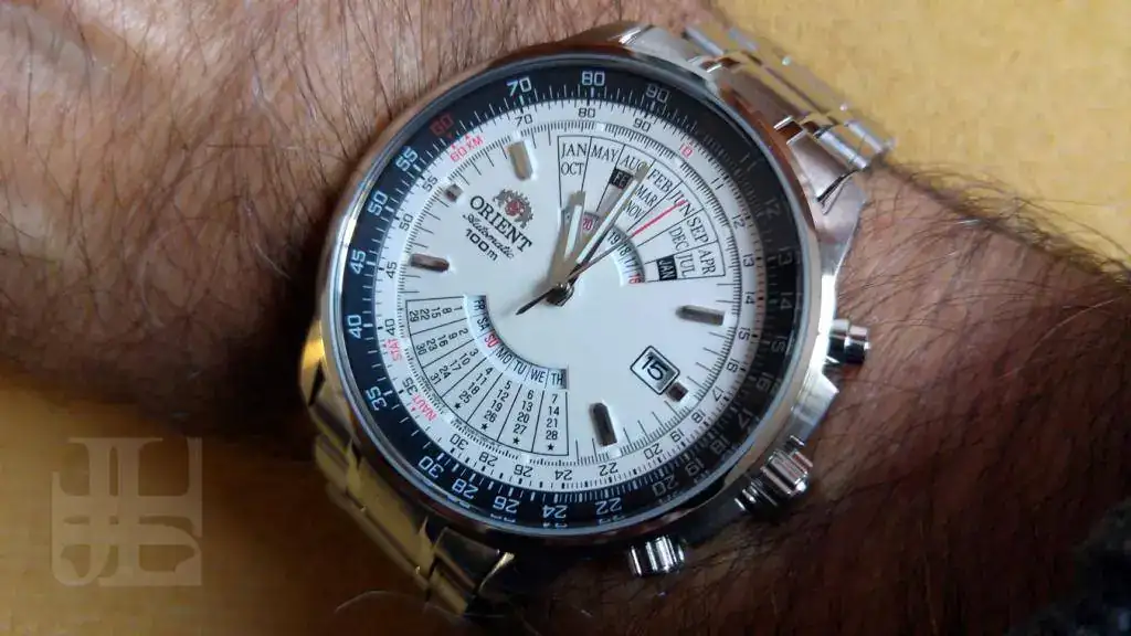 Solo hay que efectuar esto, alinear año con el mes en con el primer pulsador (arriba). En el centro la corona y abajo, se mueve la escala negra que va bajo el cristal.