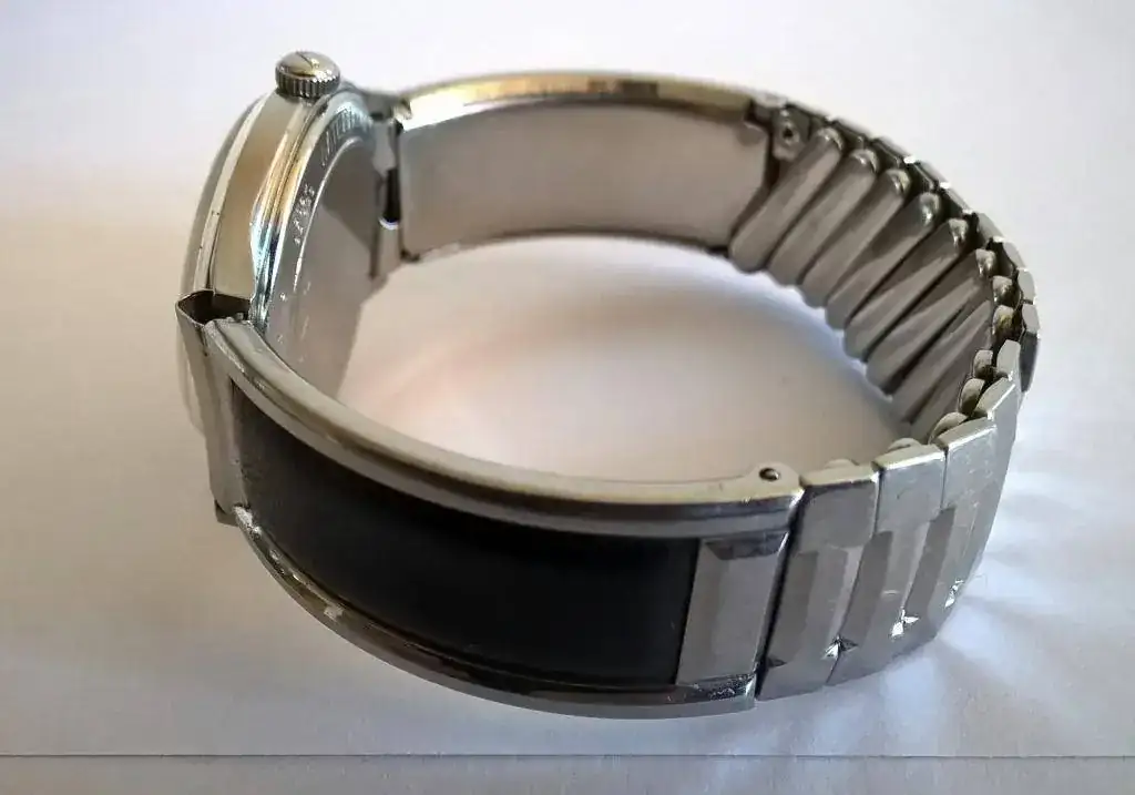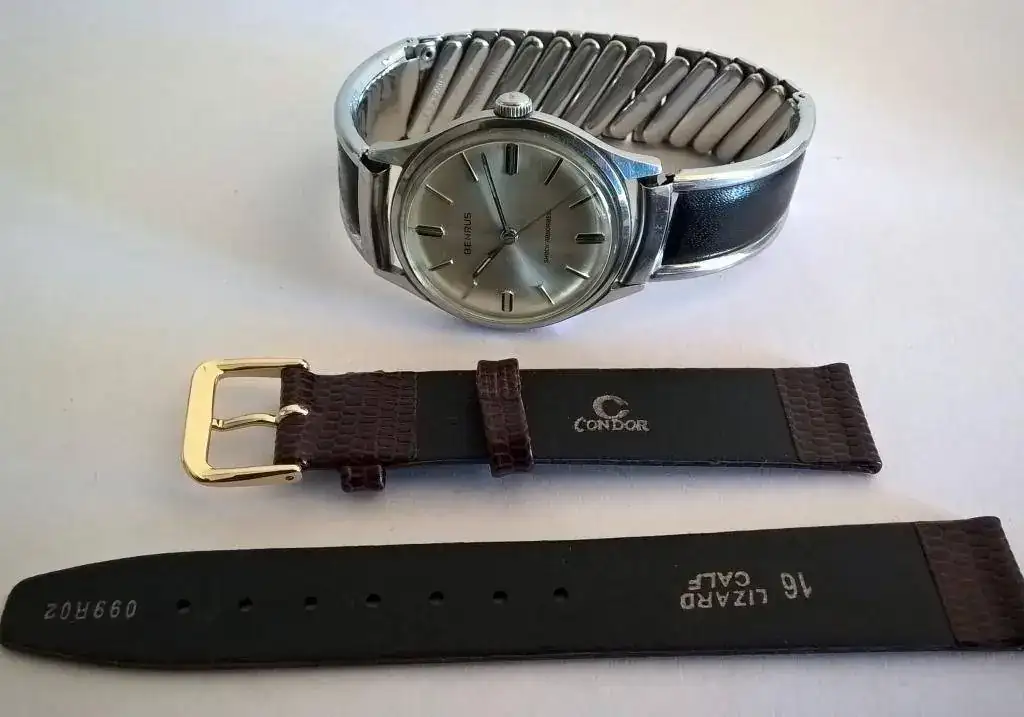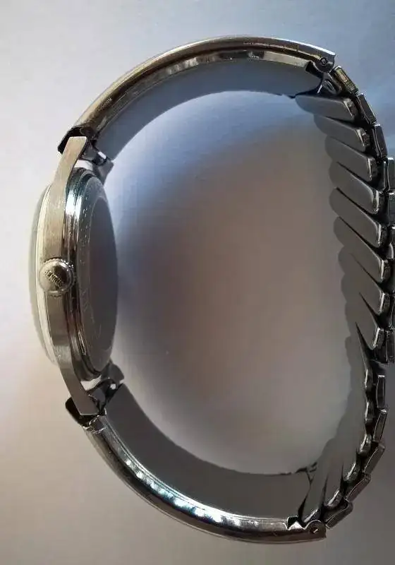 El reloj es bastante curioso y muy de su época (años 60). Para empezar es de una marca americana que montaba piezas suizas, que murió en los 70 en la crisis de los cuarzos y japoneses. Está construido en caja monobloque que se abre por delante (por el cristal), y le permitía ser Waterproof en su momento. El mecanismo no he llegado a verlo, y hay sitios que he leido que la serie 3051 lleva movimiento Circa, y en otros dice que es ETA 2372 de 17 joyas. Además tiene esa especie de armís con incrustación en piel que lo hace más vintage todavía.