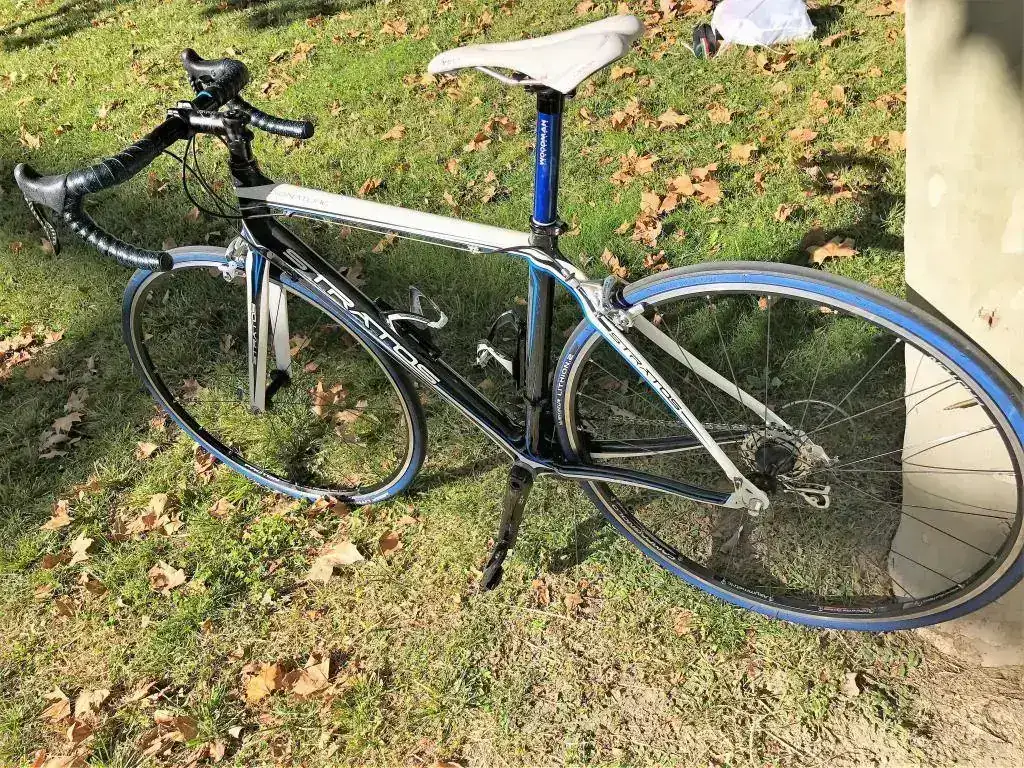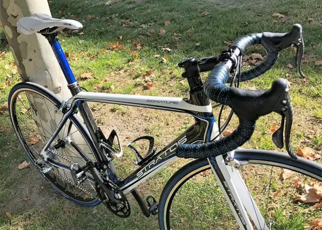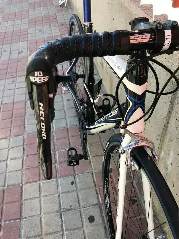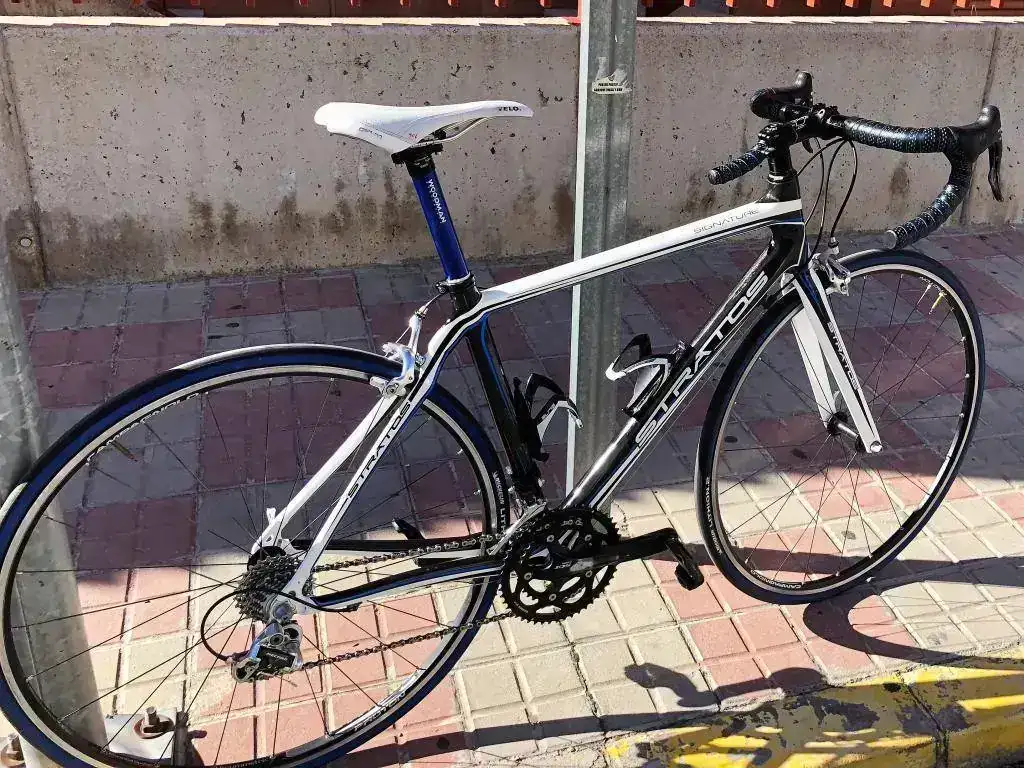 Buenas tardes, pues por necesidades y cambio a BTT vendo esta fabulosa bicicleta de carretera de la marca Stratos (BH) modelo Signature totalmente de carbono de talla 52-53 o M en color blanca, negra y azul. Es del año 2015 y esta muy bien cuidada, destaco los roces de las bielas con las zapatillas al pedalear que hace que esa zona pierda color, y pequeños retoques en la pintura en la zona del portabidones, sin ninguna importancia. Muy bien cuidada y mantenida y con excepcionales componentes que paso a describir: