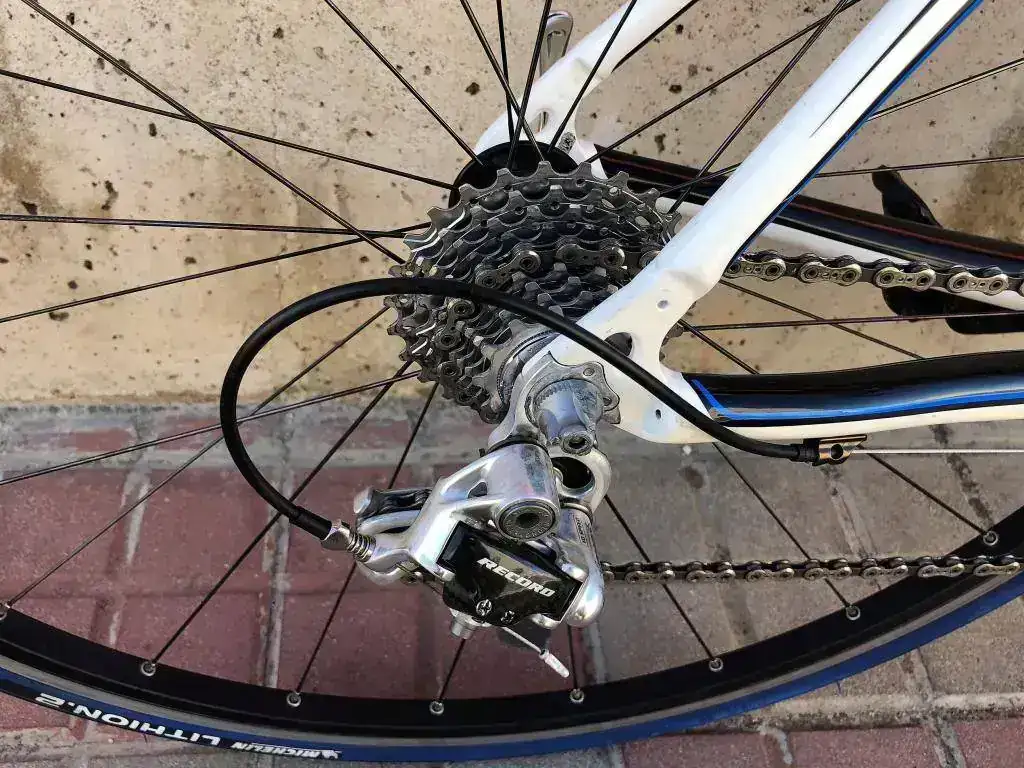 - Manetas y cambio trasero : Campagnolo Record de carbono de 10 velocidades.