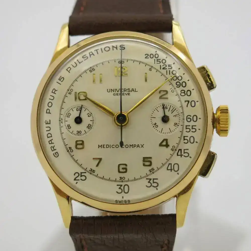 A partir de aquí, Universal Geneve aprovecha el tirón de "Compax" (vale la pena leer la página que os he puesto más arriba: no sólo Wilsdorf sabía de marketing) para presentar los Aero-Compax, con la subesfera de las 12 con y una corona extra a las nueve que *no* es un segundo huso horario sino una especie de recordatorio, los Medico Compax, que son Uni-compax o Compur con una escala de pulsaciones, o los Space-Compax en los años 70 del siglo pasado, nombre posiblemente influido por la entonces reciente llegada a la Luna de Omega. O los Dato-Compax con la subesfera a las 12 dedicada a indicar los días del mes.